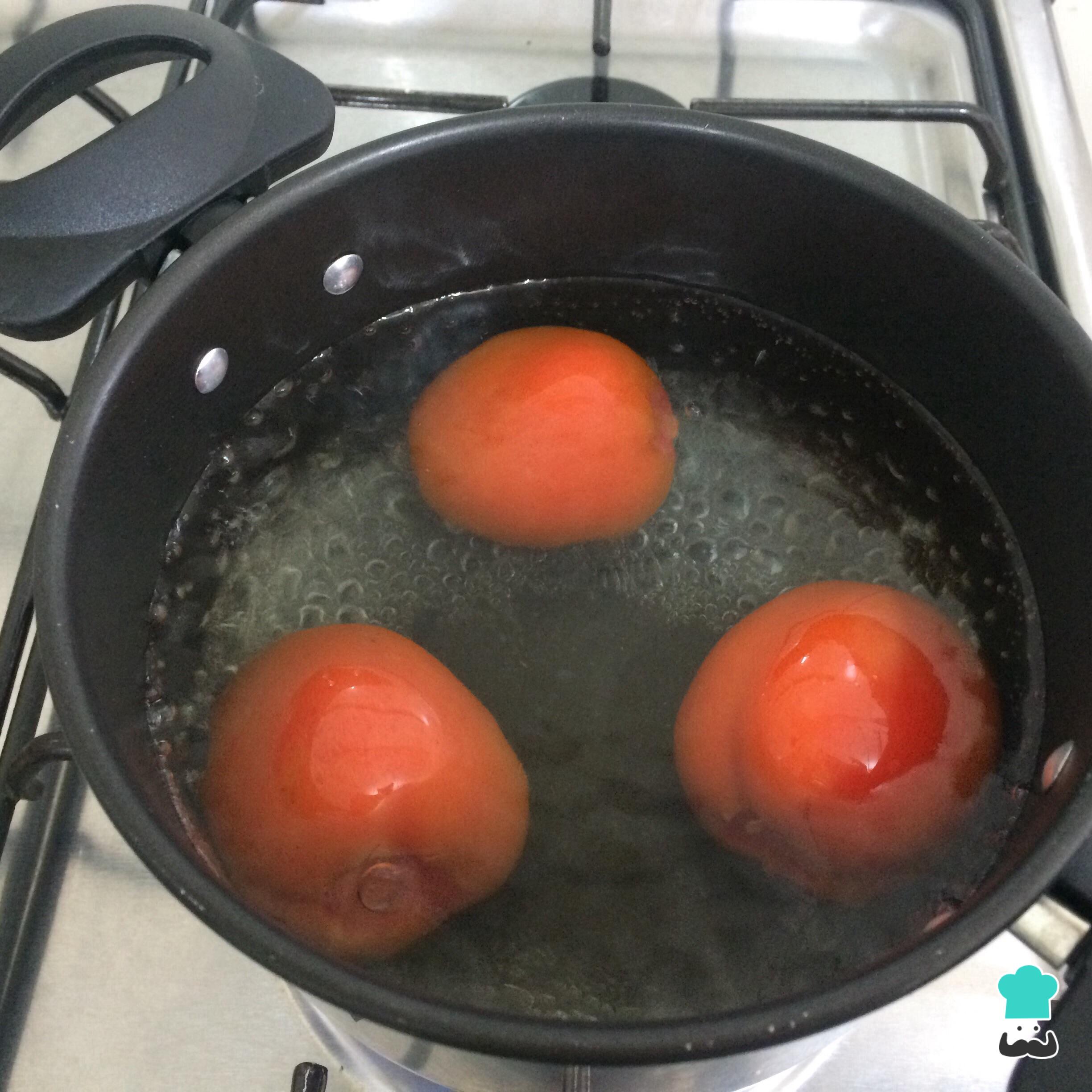 Passe os tomate por água fervente (fazendo uma cruz com uma faca na parte inferior) durante 5 minutos. Quando estiverem prontos escorra a água e descasque os tomates, processe no liquidificador até obter uma mistura homogênea.