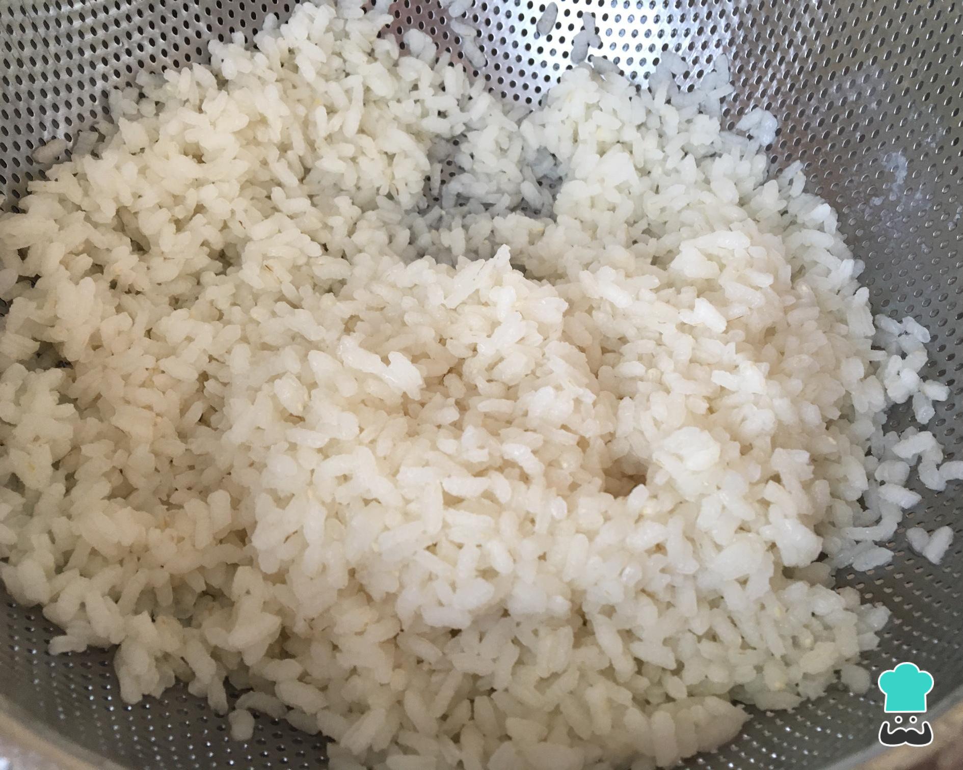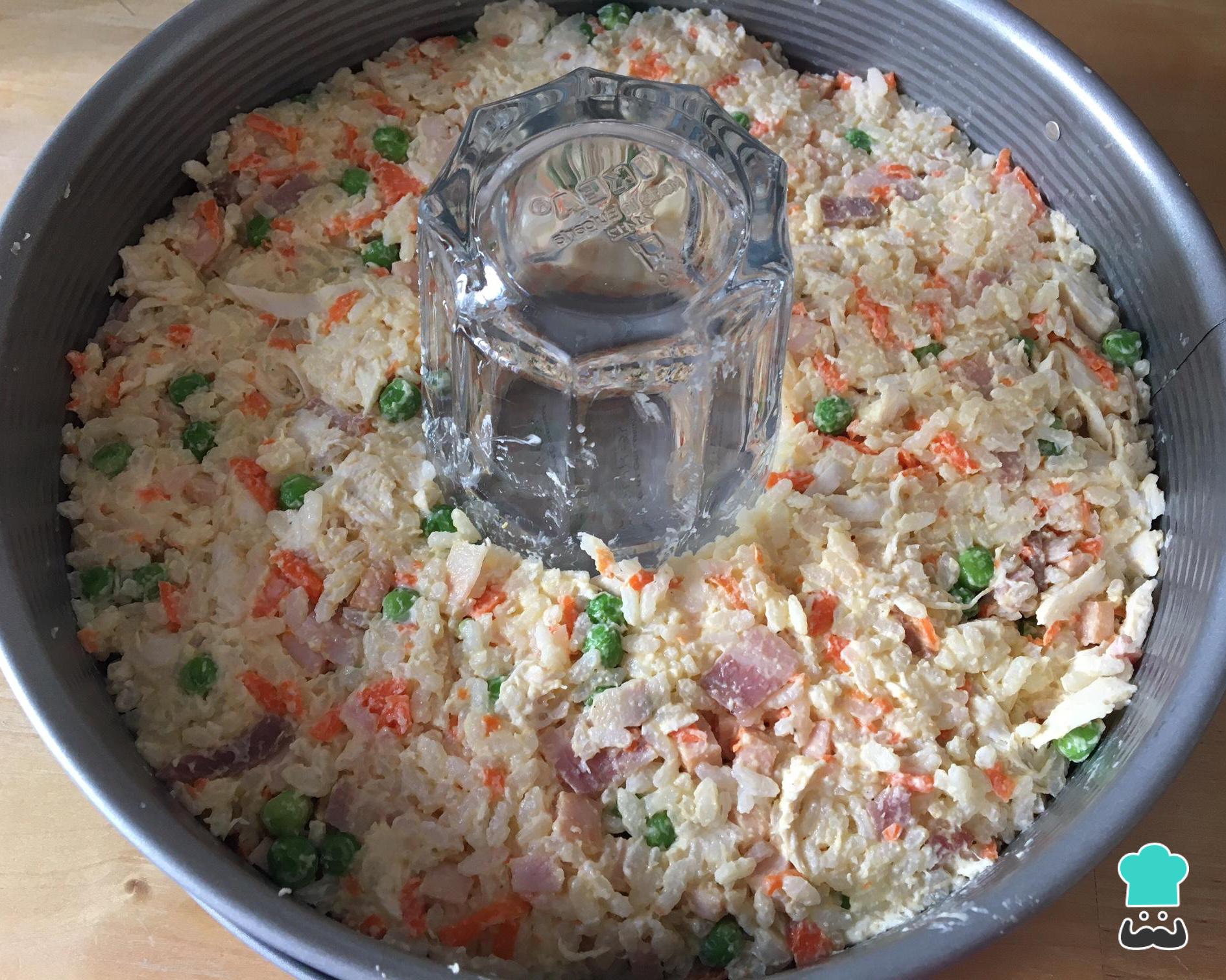 Coloque essa mistura do arroz à grega numa forma com furo central e pressione com uma colher, para deixar o arroz o mais compacto possível. Reserve na geladeira por 30 minutos.
