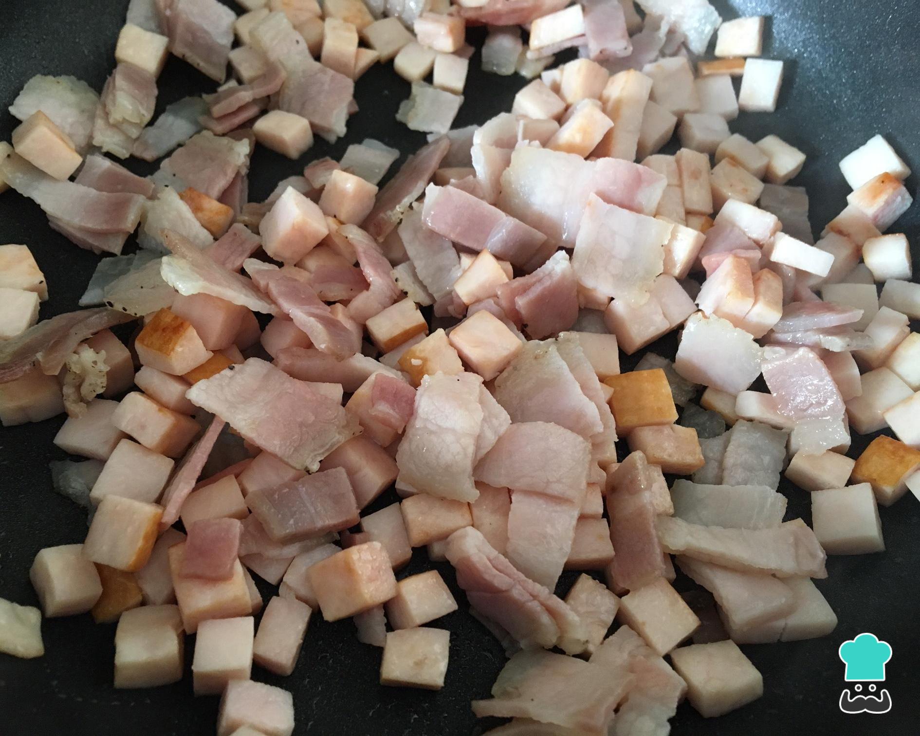 Leve também ao fogo uma frigideira com o presunto e o bacon picados. Salteie até que o bacon solte sua gordura e comece a dourar junto com o presunto.