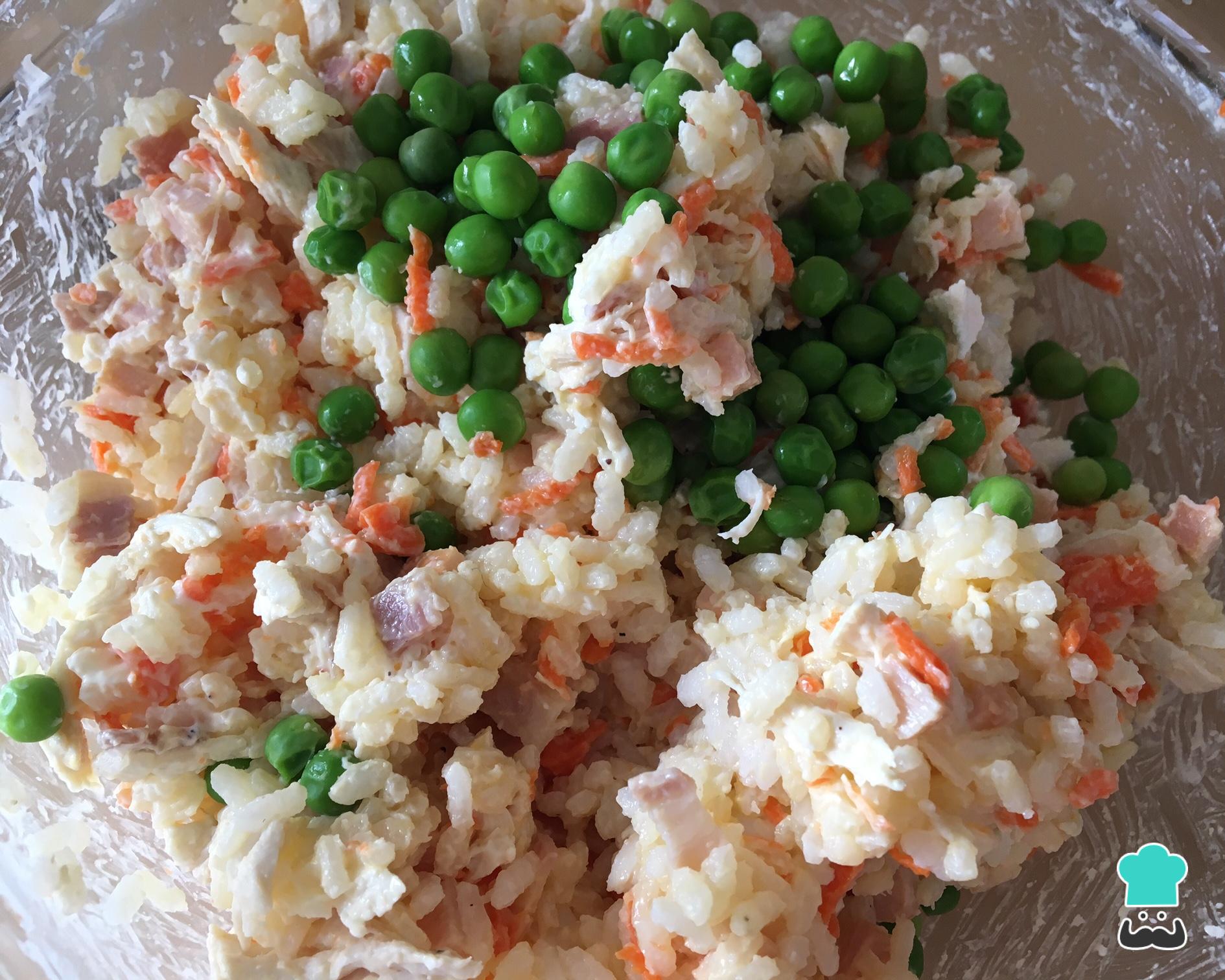 Depois de preparar todos estes ingredientes do arroz à grega, coloque-os num bowl e misture: o arroz, a cenoura, o frango desfiado, o bacon, o fiambre, as ervilhas e a maionese. Coloque sal e pimenta a gosto.