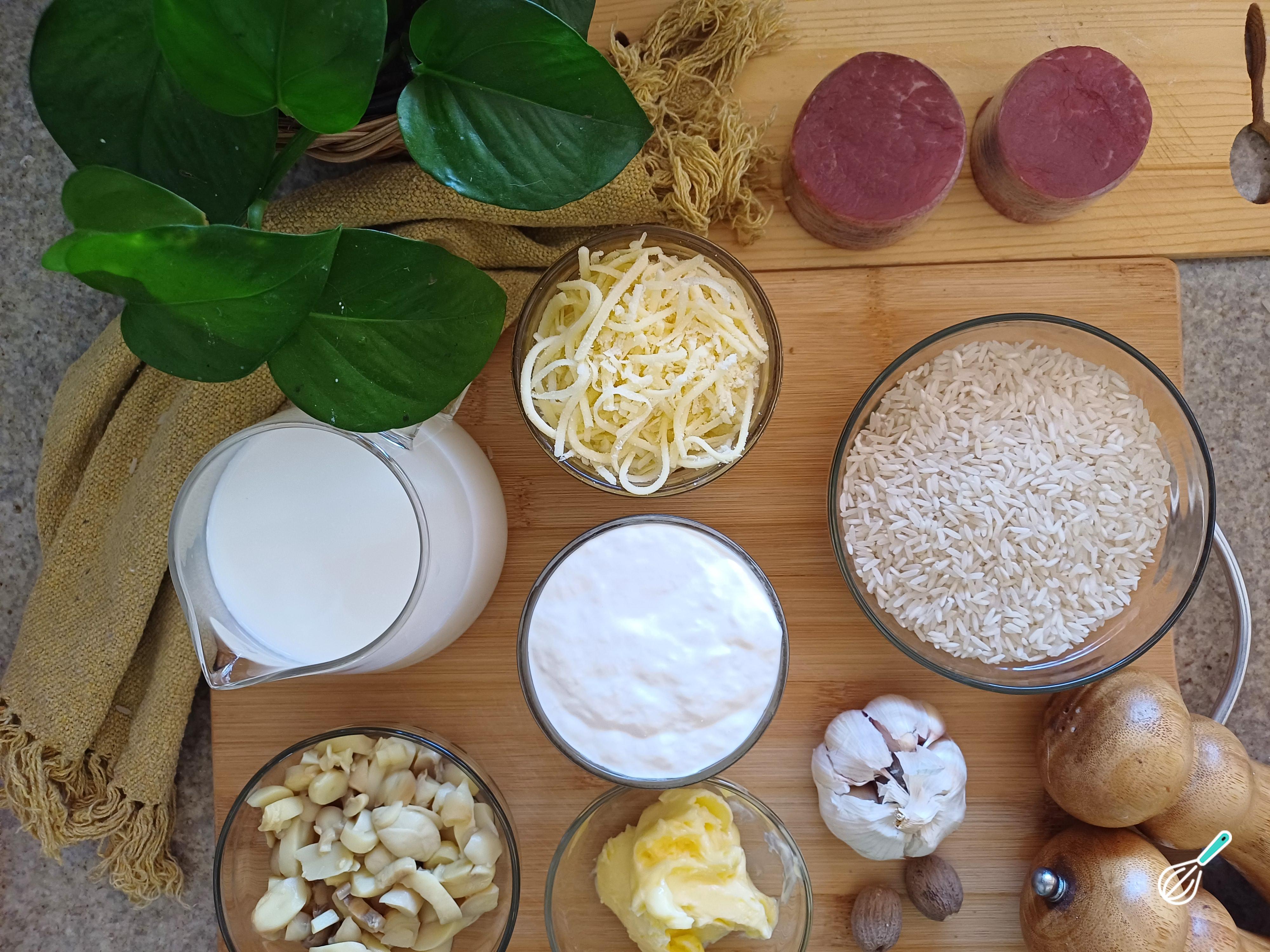 Separe os ingredientes necessários para preparar esta receita de arroz à piamontese com medalhão.
