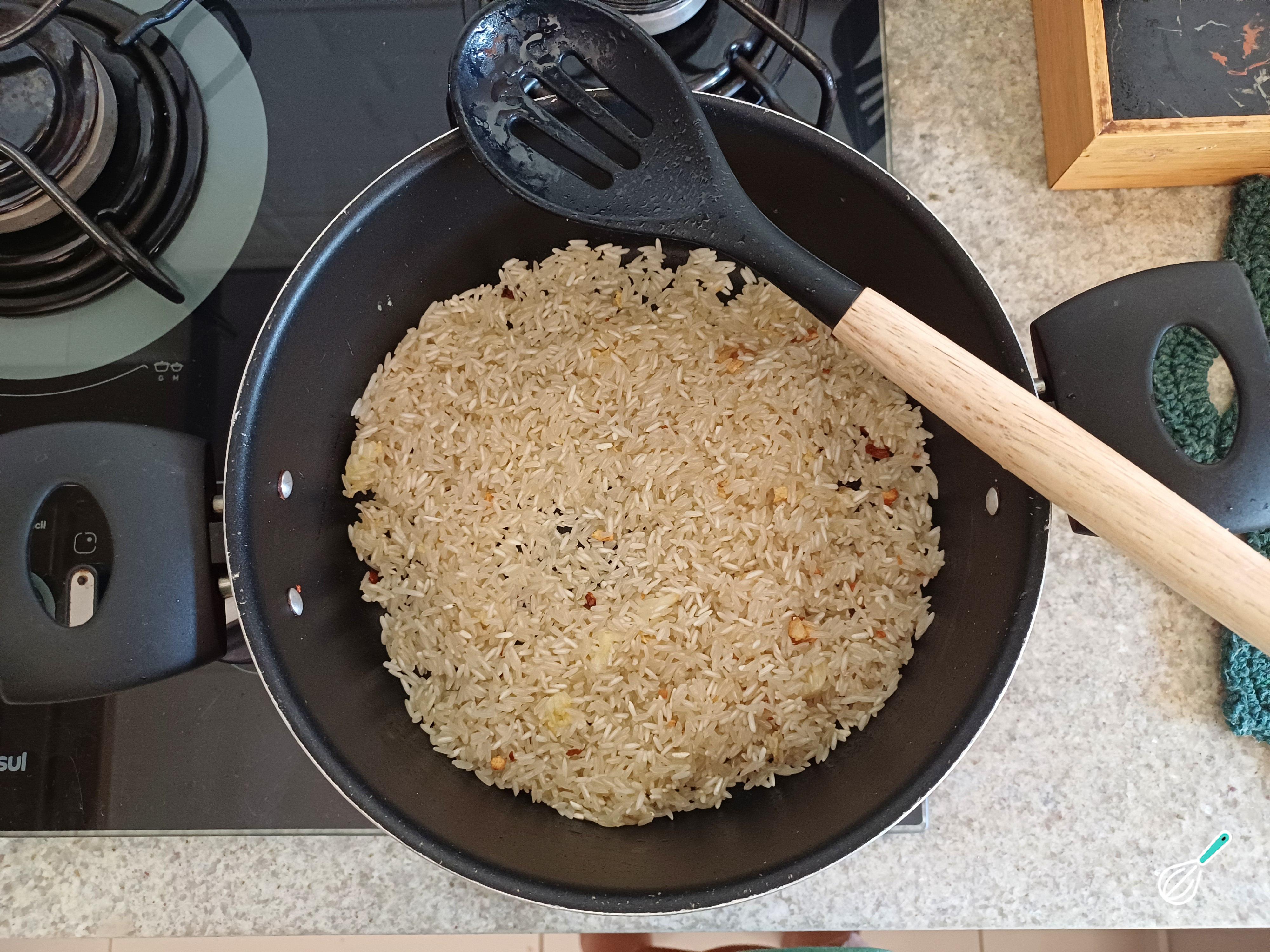 Adicione o arroz e refogue bem.