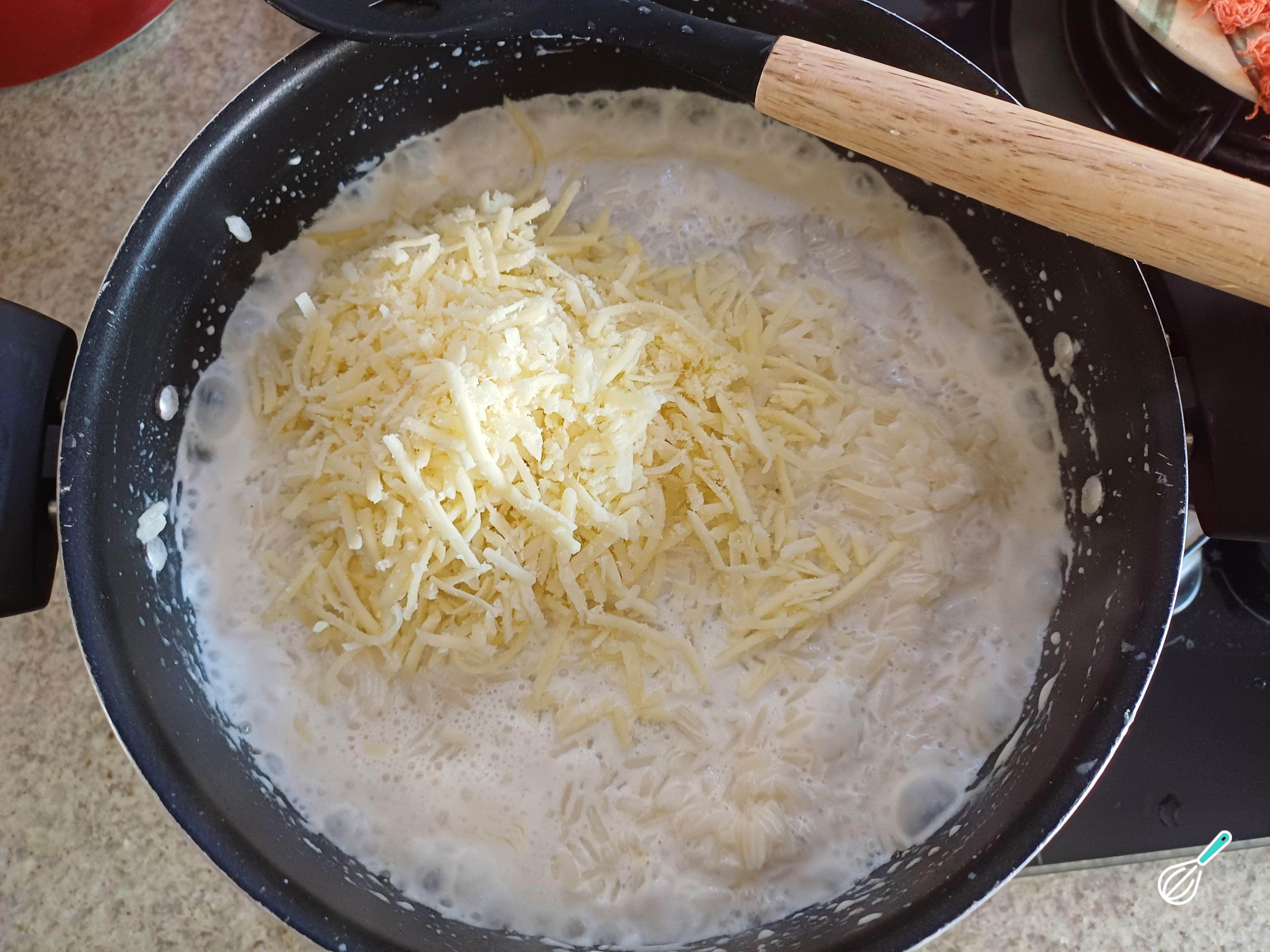Junte o queijo parmesão ralado, mexendo até derreter e ficar homogêneo.