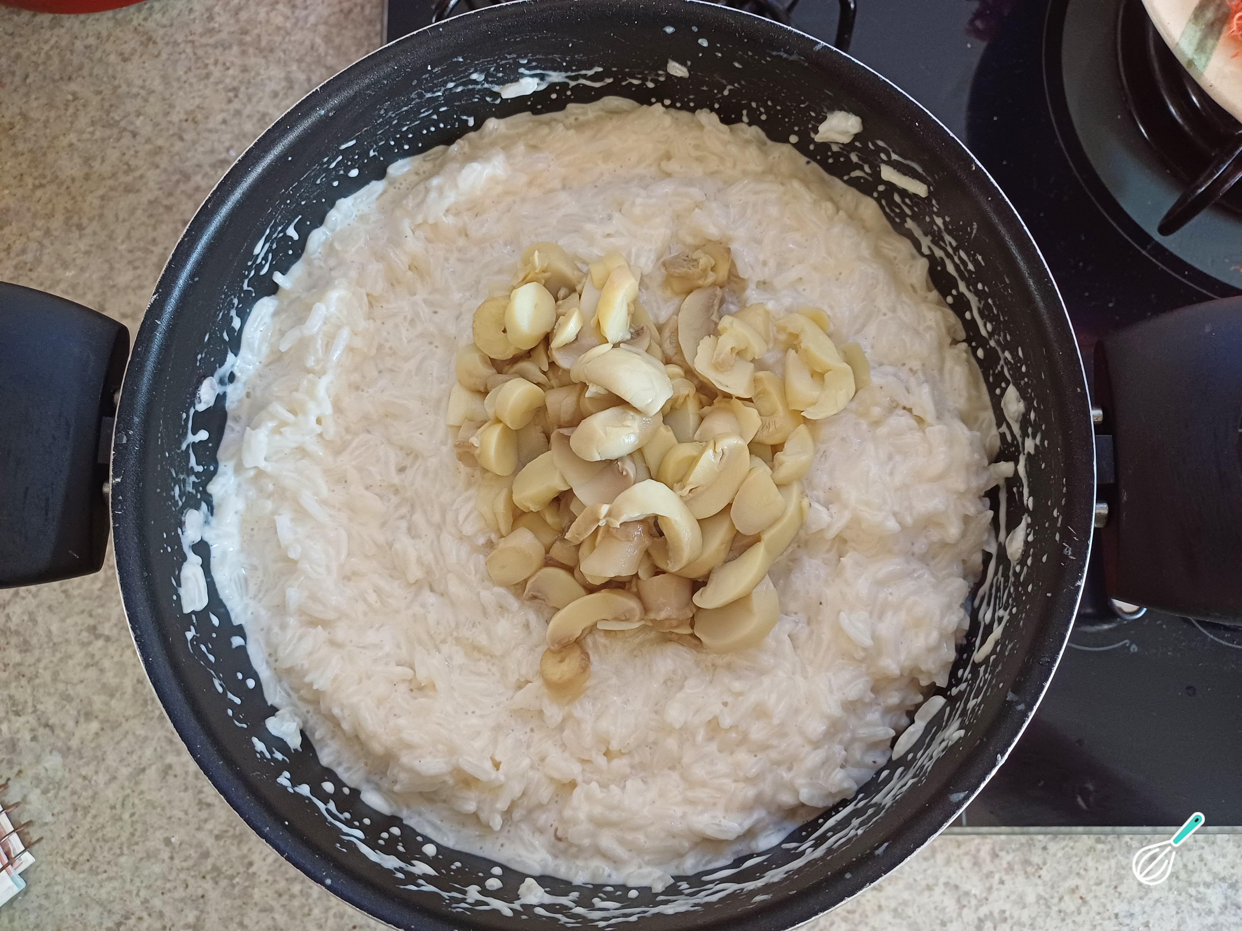 Finalize adicionando o champignon fatiado e misture levemente. Reserve.