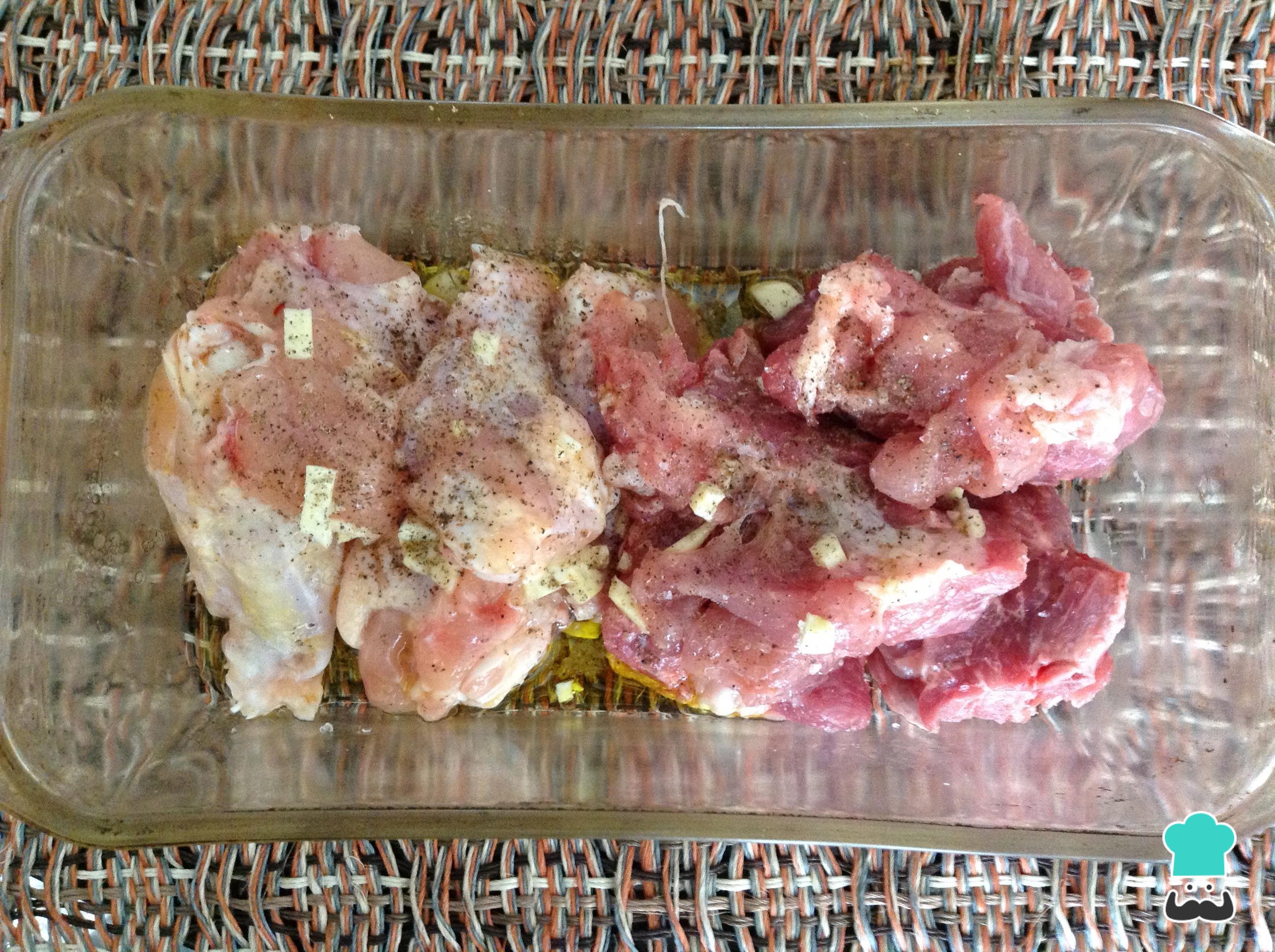 Coloque em um refratário as pernas de frango e a carne de porco, adicione duas colheres de sopa de azeite, os alhos picados finamente, sal e pimenta a gosto. Leve ao forno durante 30 minutos a 160ºC.