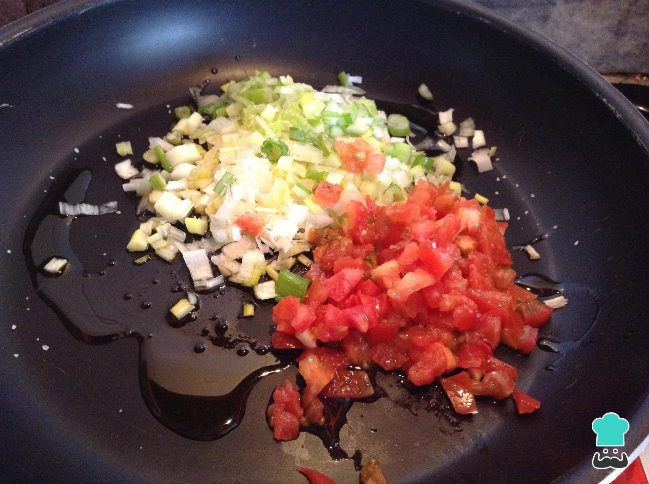 Enquanto a carne assa pique a cebolinha e o tomate em pedaços pequenos. Leve ao fogo uma frigideira com um pouco de azeite e refogue esses ingredientes muito bem durante 1 minuto.