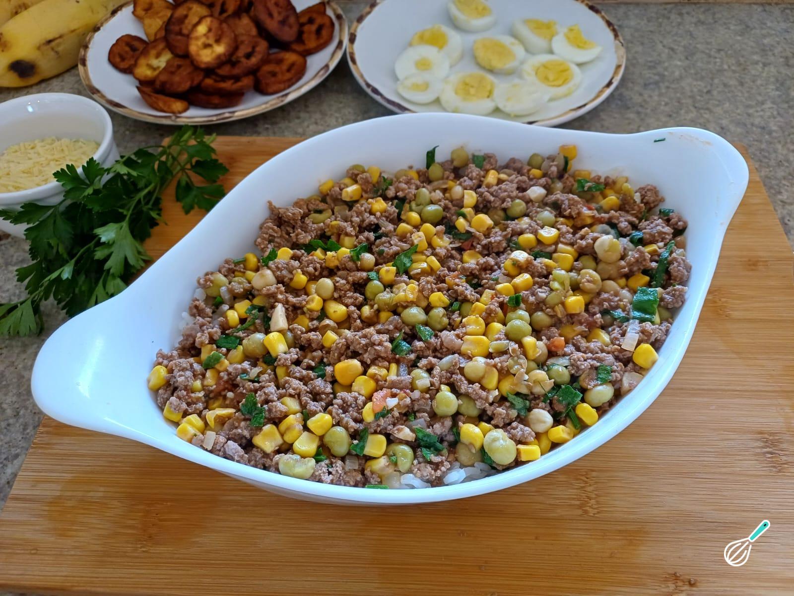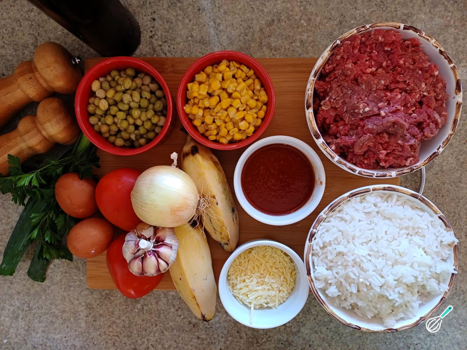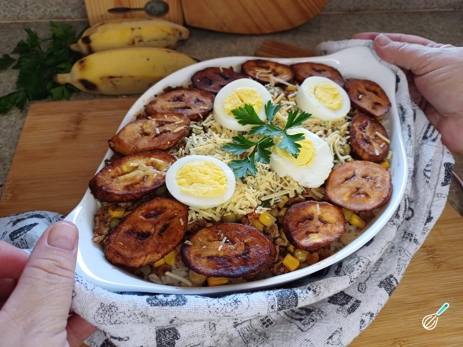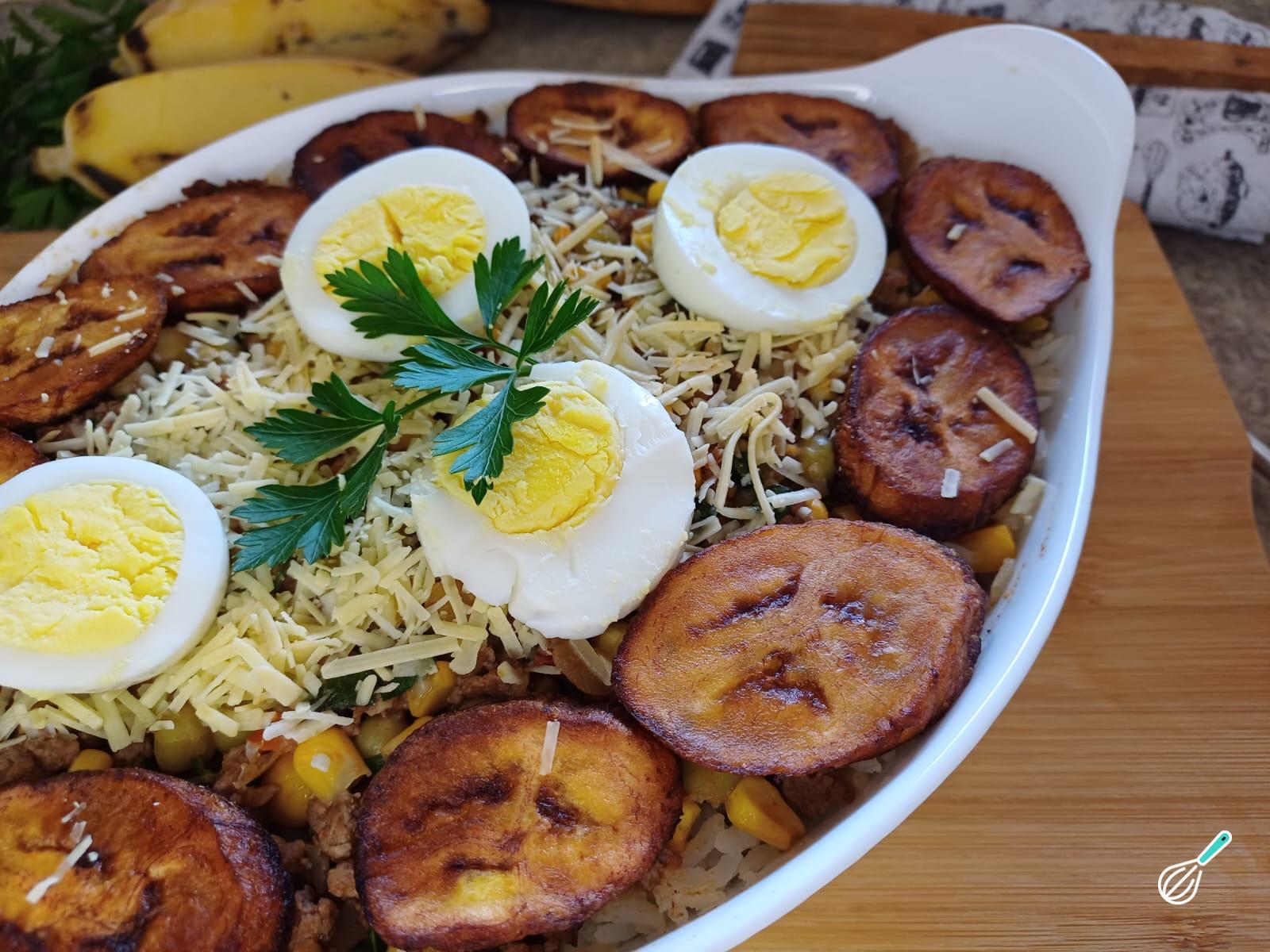 Em uma travessa refratária, que possa ir ao forno, faça uma camada de arroz, uma camada de carne, sobreponha algumas rodelas de banana da terra fritas e repita as camadas, terminando com uma camada de carne.
