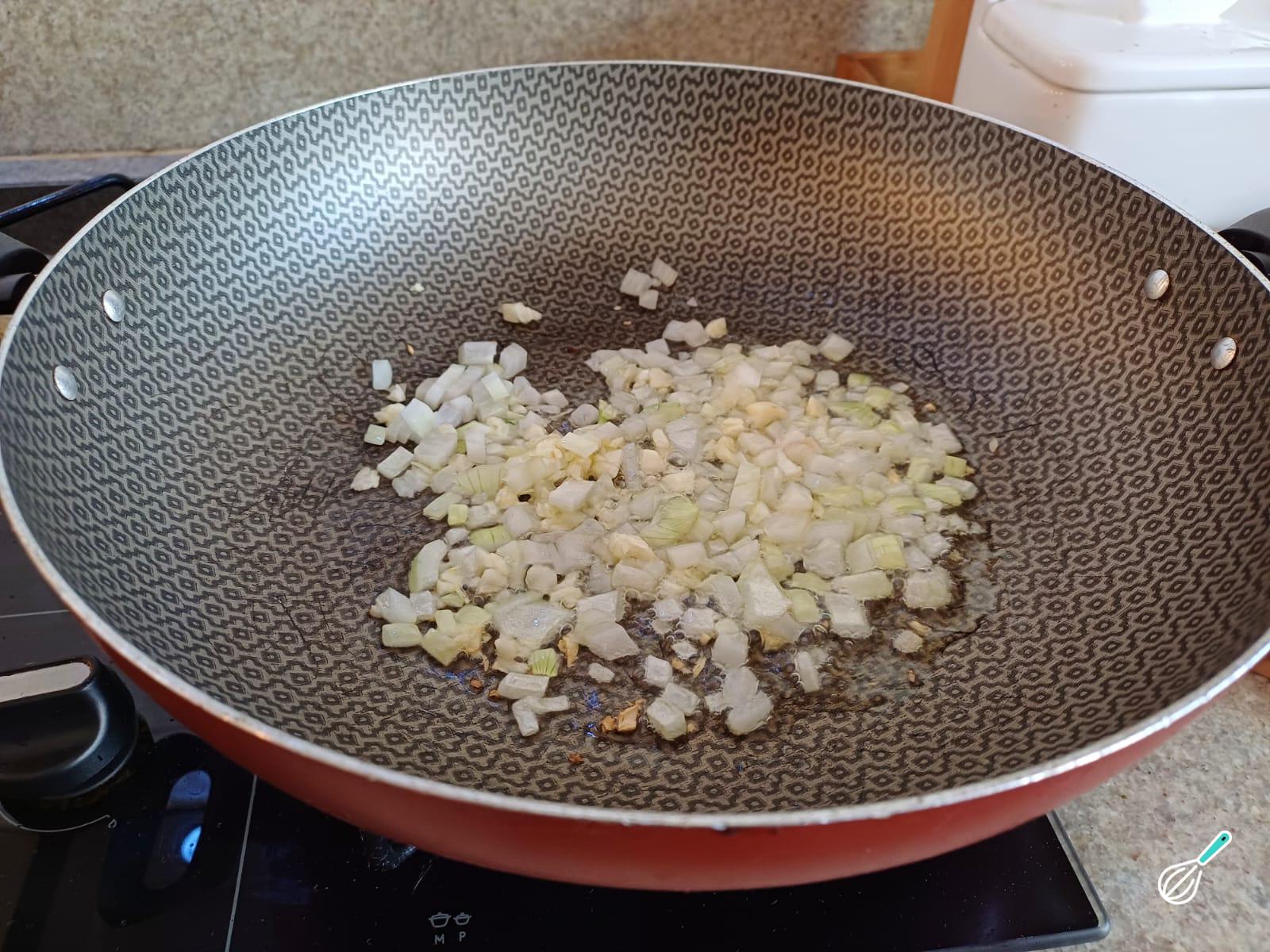 Em uma panela média, aqueça o azeite e refogue o alho e a cebola picada, até começar a dourar.
