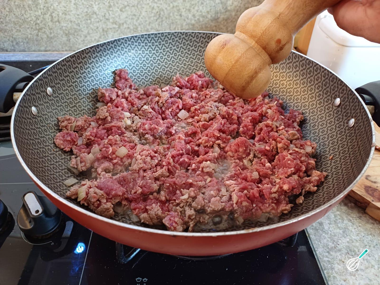 Adicione a carne moida e vá mexendo até refogar a carne e ficar soltinha. Tempere com sal a gosto e outros temperos de sua preferência.