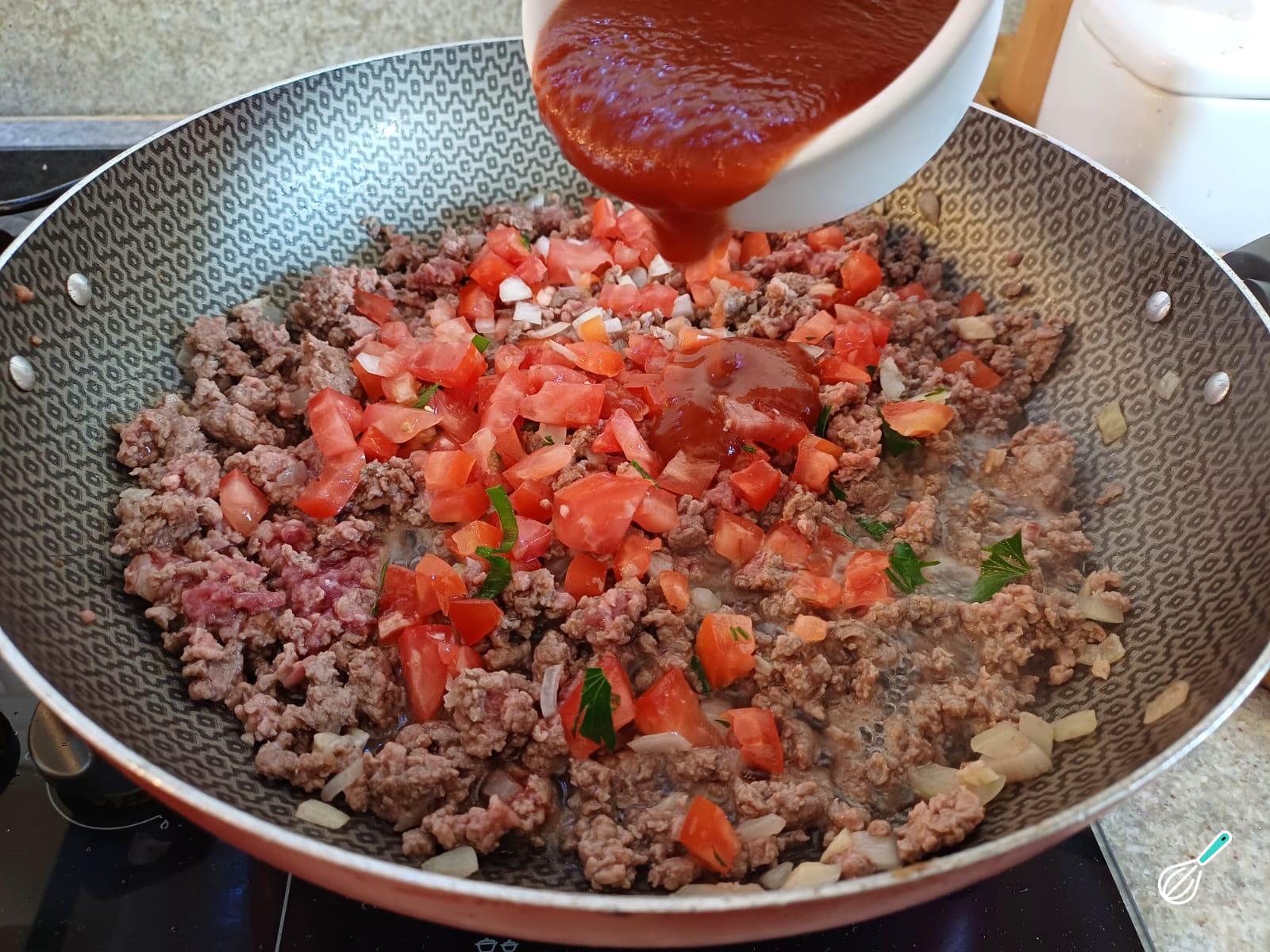 Junte os tamates picados e o extrato de tomate e deixe refogar por mais alguns minutos, até que o tomate derreta.