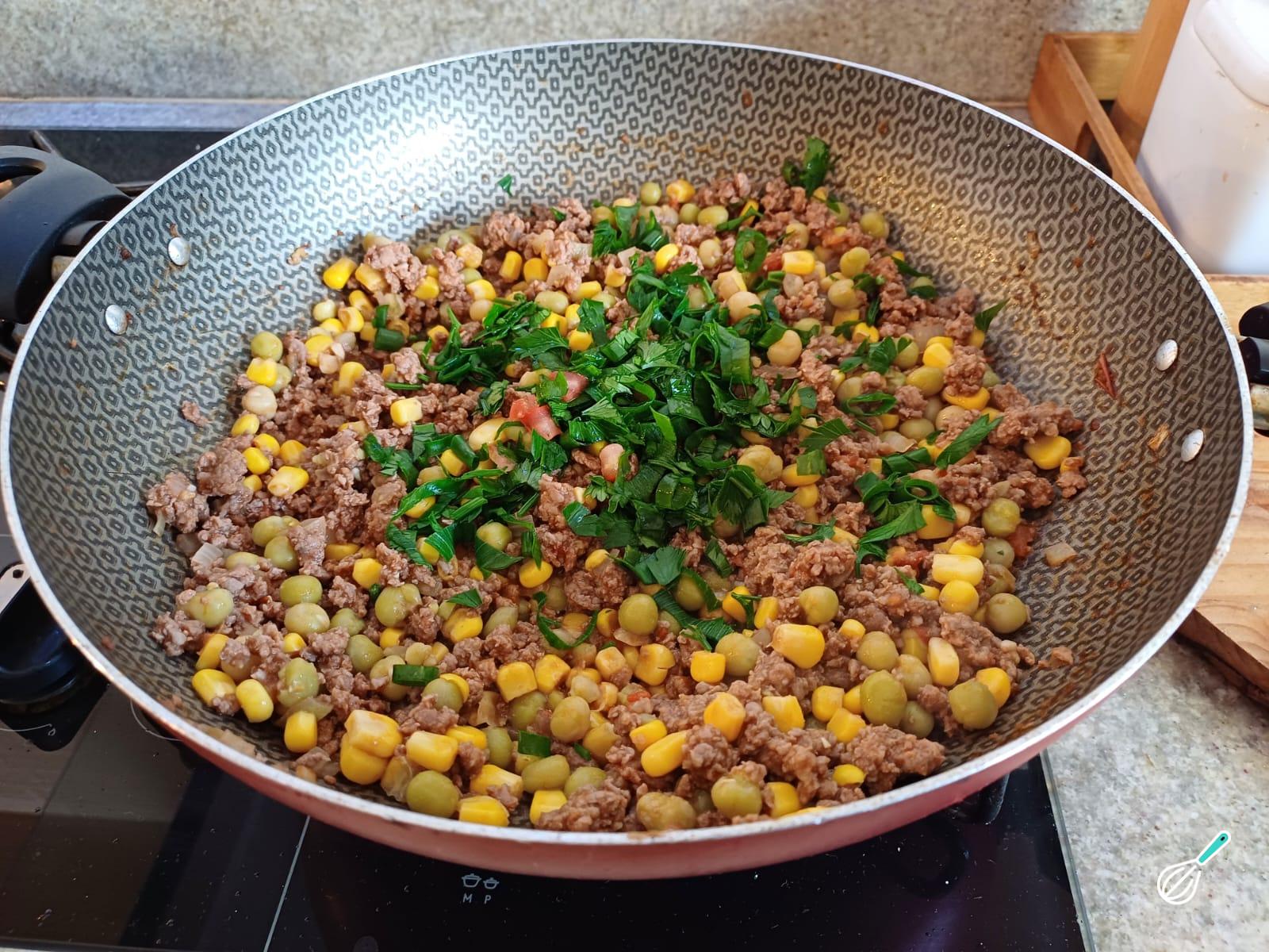 Acrescente a ervilha em conserva e o milho em conserva e misture muito bem. Finalize com salsinha picada a gosto. Desligue o fogo e reserve.