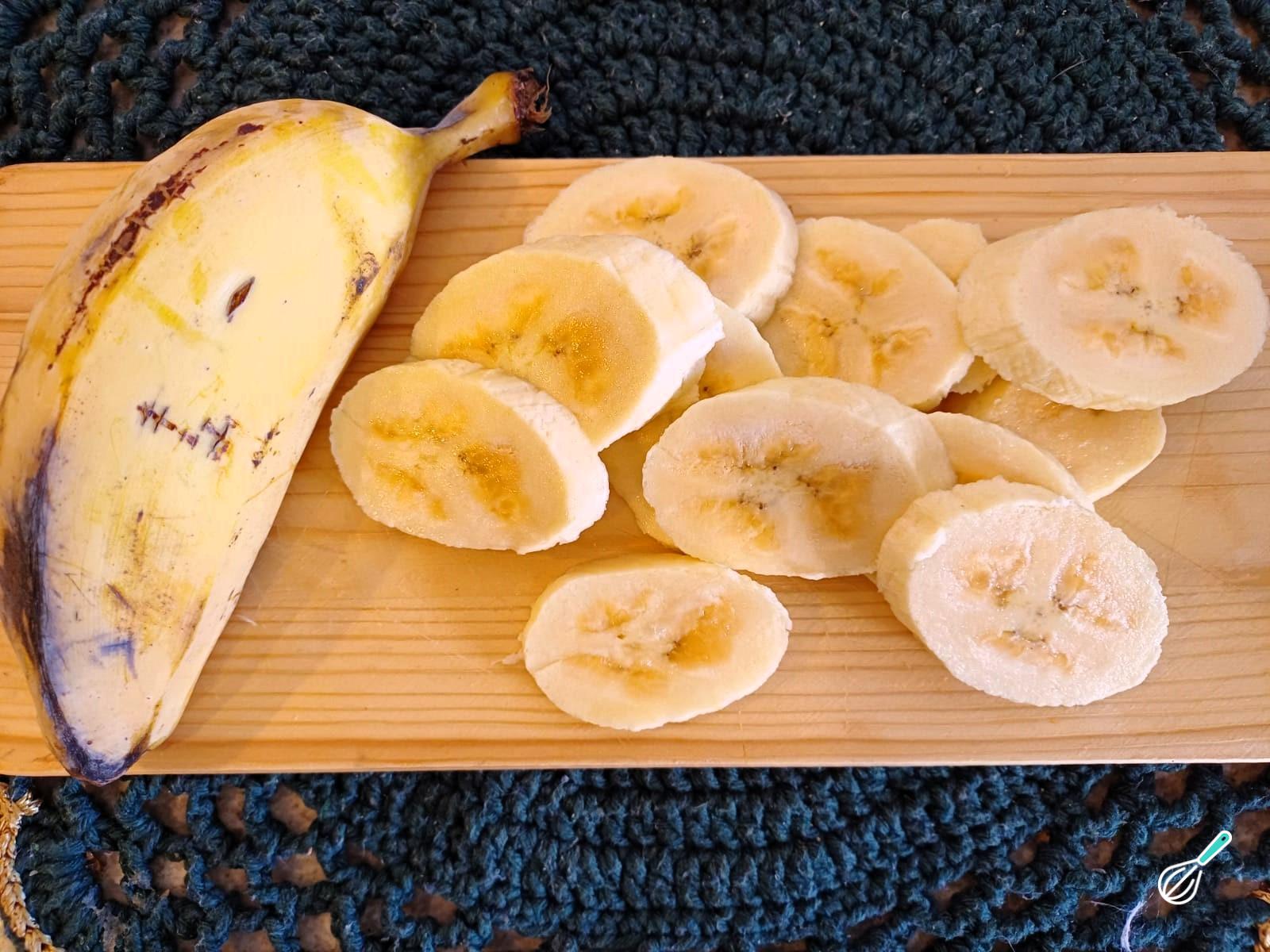 Descasque e corte as bananas em rodelas não muito finas, e frite-as em óleo quente, até começar a dourar. Retire da frigideira e coloque em um recipiente com papel absorvente para escorrer a gordura.