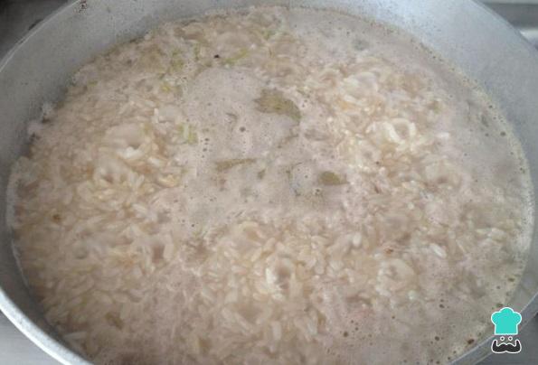 Junte o arroz à água fervente, tempere com sal a gosto e deixe cozer por 10 a 12 minutos.