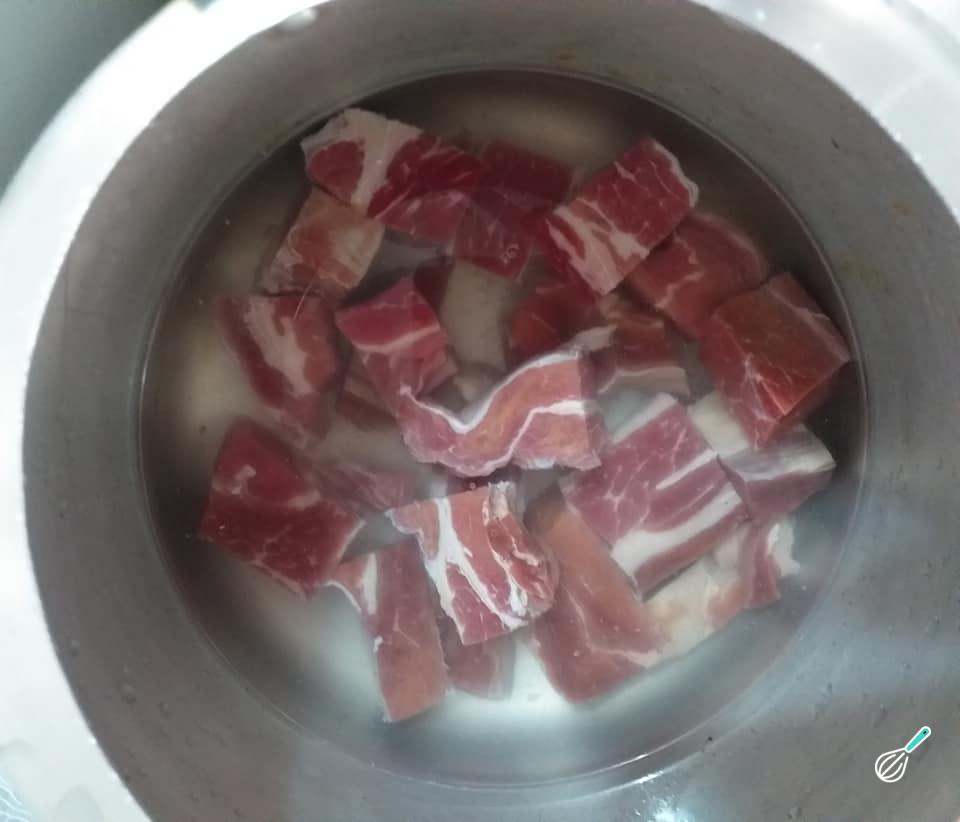 O primeiro passo para a receita é dessalgar a carne seca. Corte a carne em pedaços médios e coloque numa panela com água, levando ao fogo até começar a fervura. Descarte a água fervida e repita o processo mais 2 vezes.