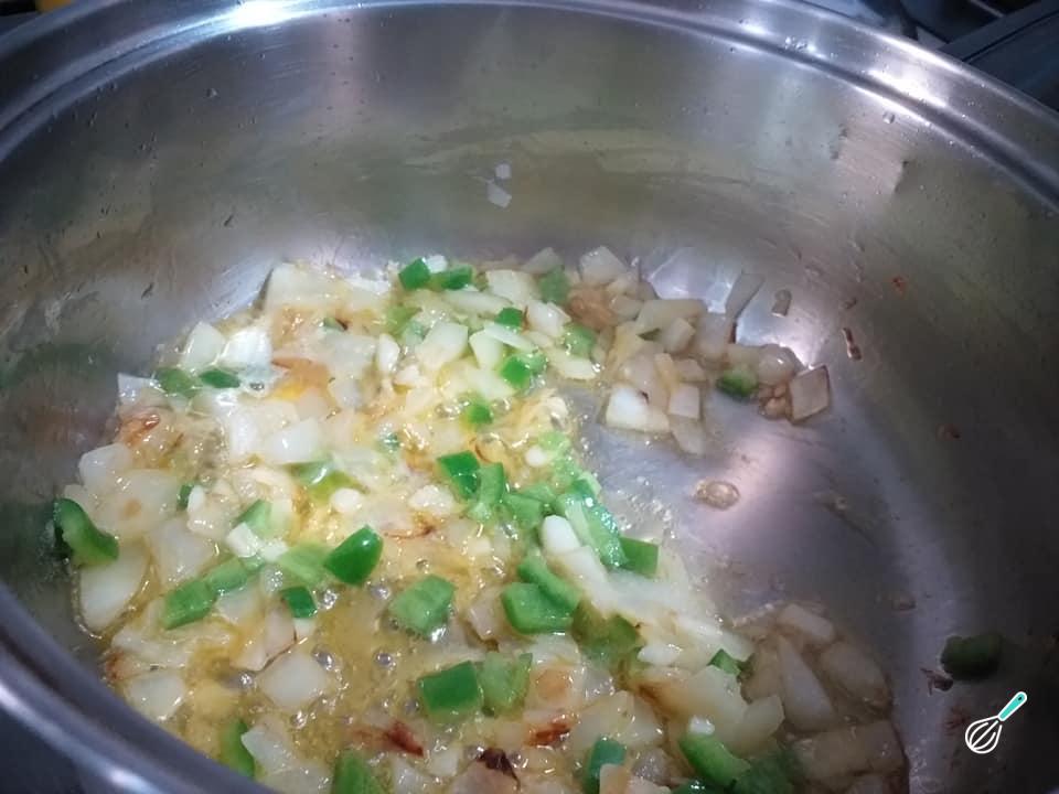 Numa panela média, aqueça o óleo e refogue a cebola e o alho. Em seguida, adicione a manteiga e o pimentão.