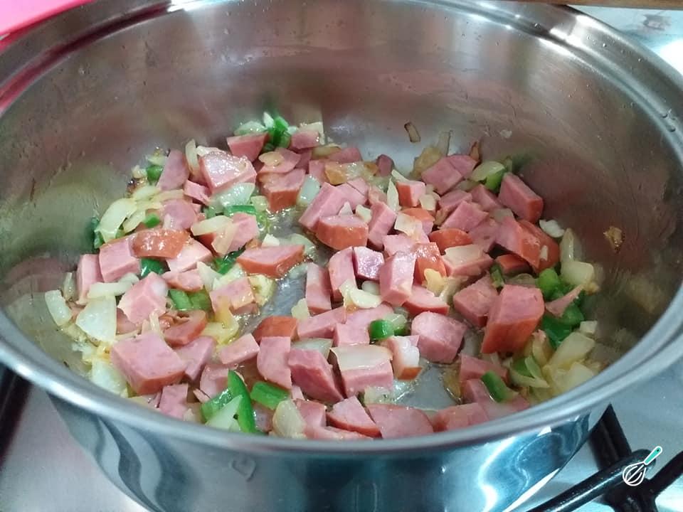 Acrescente a calabresa picada e refogue mais alguns minutos, até dourarem levemente.
