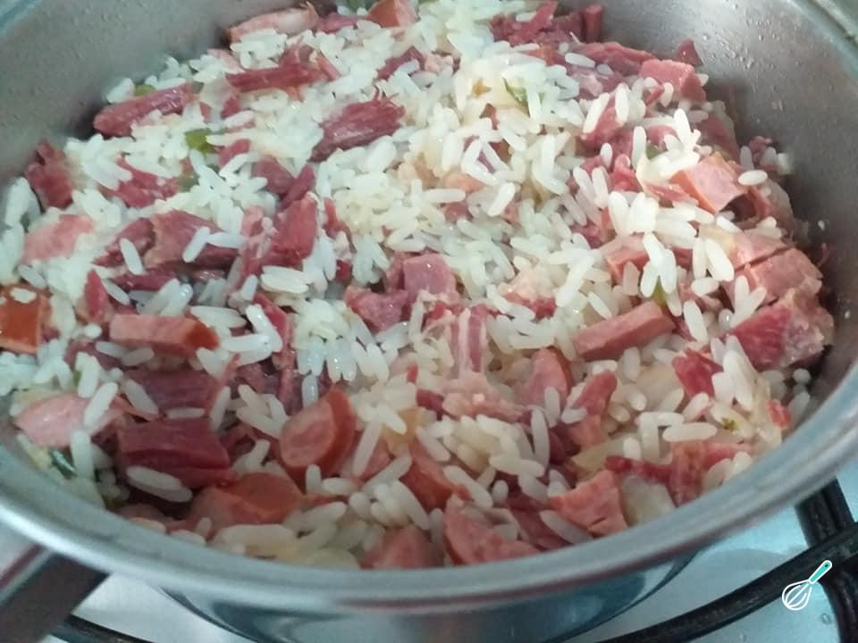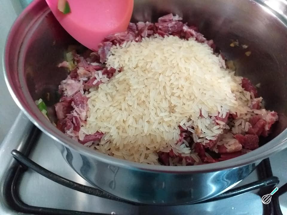 Neste momento, adicione o arroz e a carne seca desfiada, misturando bem.