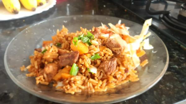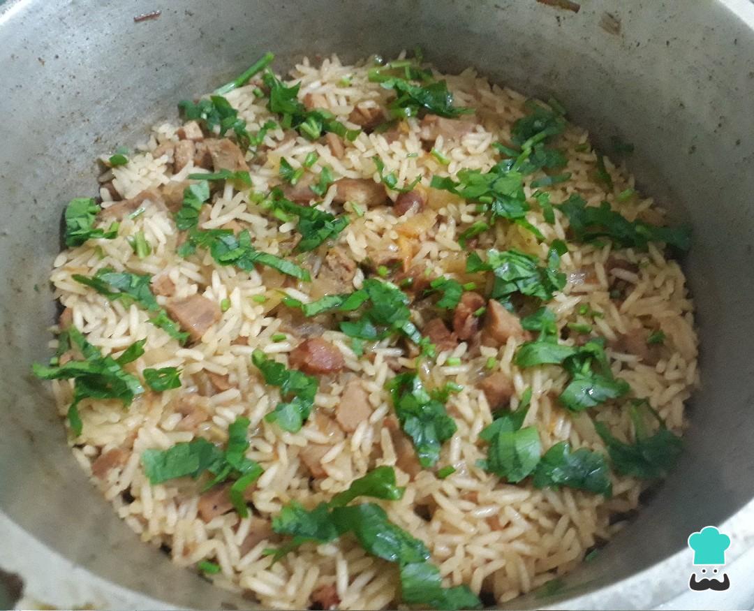 E estará pronto seu carreteiro! Finalize com cheiro verde e sirva acompanhado com ovo frito e banana. Bom apetite e diga nos comentários o que você achou desta receita de arroz carreteiro suíno!