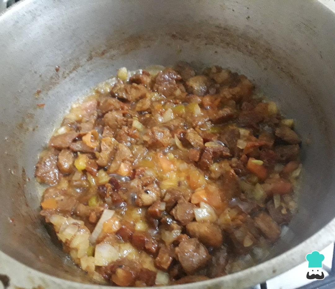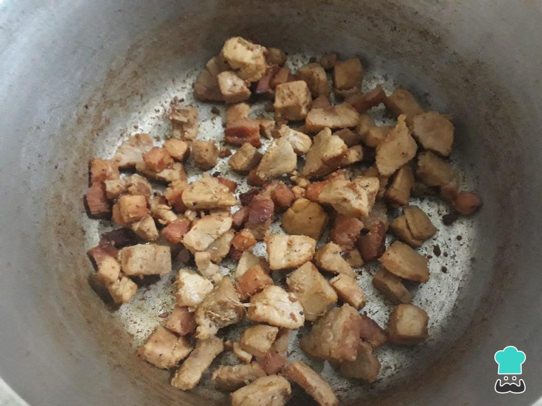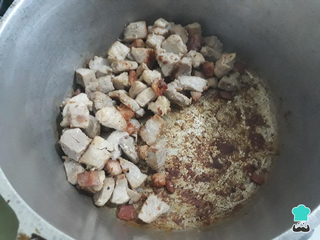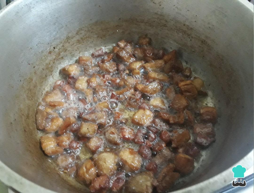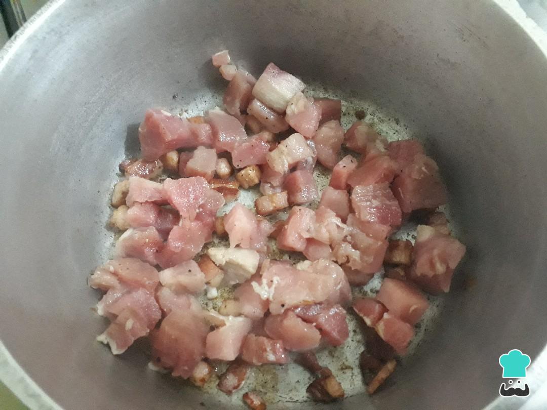 Em uma panela frite o bacon até ficar bem dourado. Depois retire o óleo que soltar por completo e adicione a carne suína.