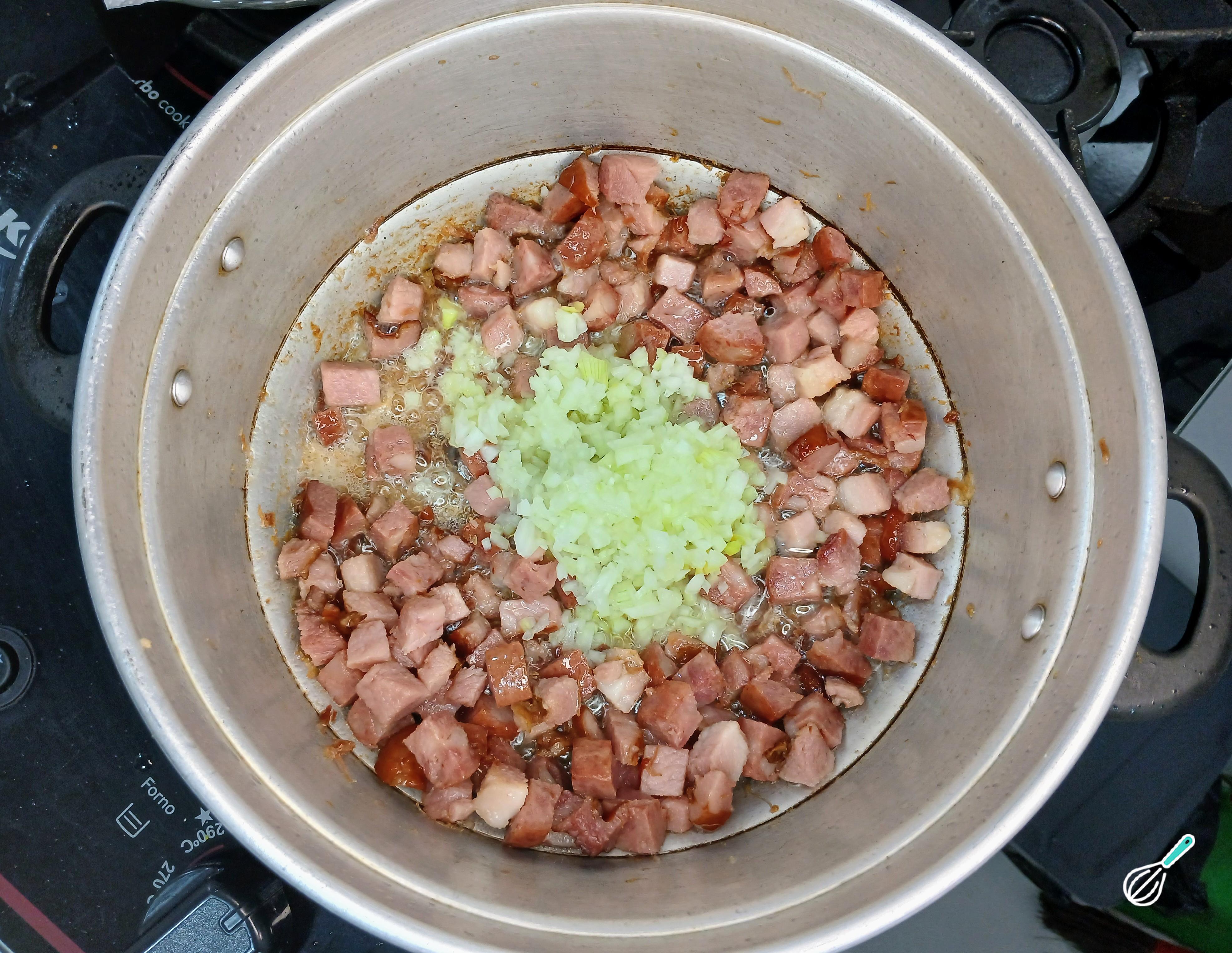 Depois de retirar a carne seca, coloque a linguiça e o bacon para fritar, nesse ponto da receita adicione um pouco mais de óleo. Deixe que frite bem e, em seguida, adicione a cebola e o alho para que refoguem junto com a linguiça e o bacon. Assim que estiverem fritos, retire e coloque para escorrer assim como foi feito com a carne seca.