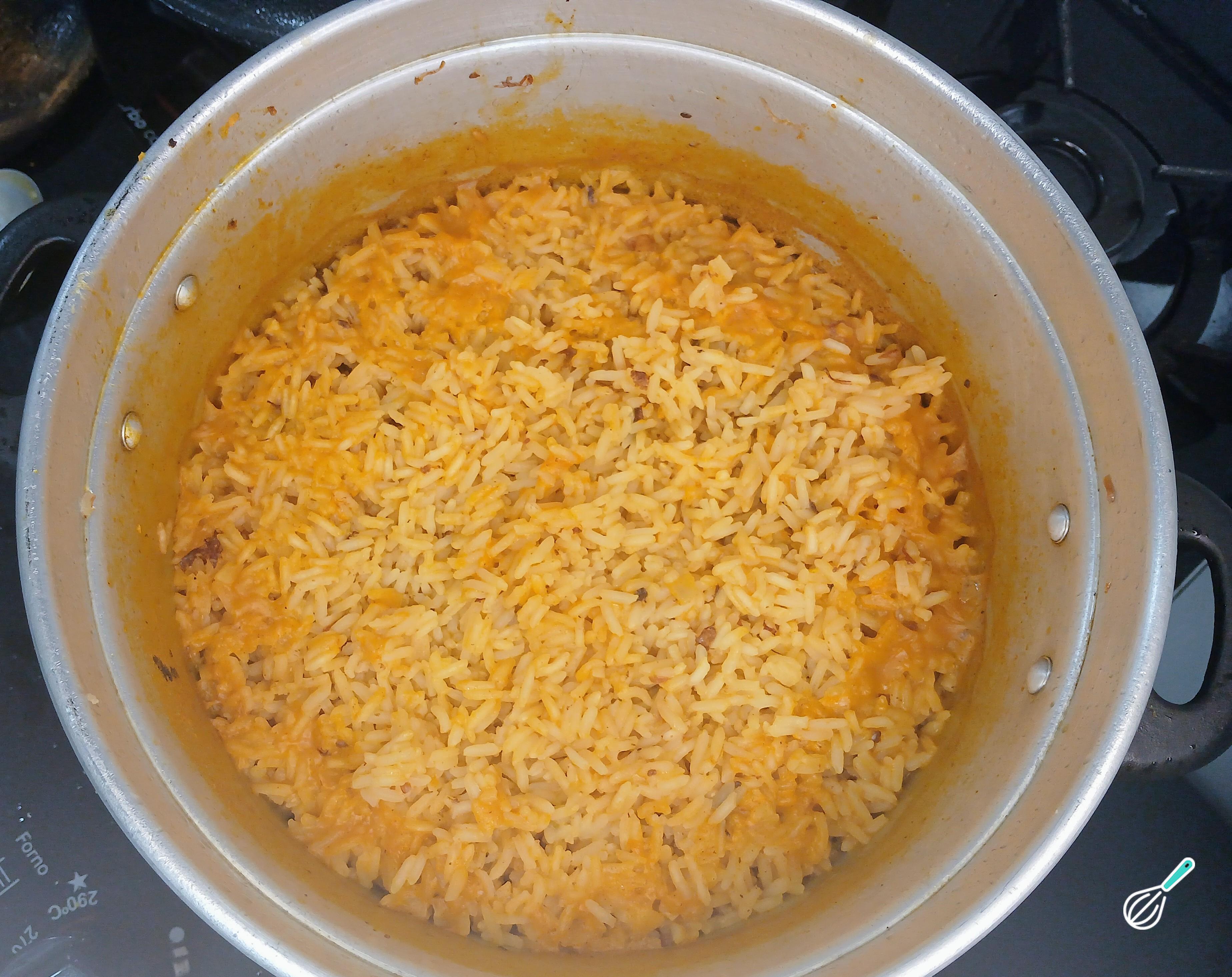 Prove o arroz e, se necessário, adicione mais água para cozinhar. Não deixe que cozinhe muito. Acerte sal e pimenta conforme o seu gosto. Desligue o fogo e deixe o arroz amornar para misturar as carnes.