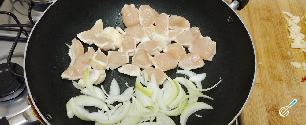 Para continuar com o molho de arroz chinês, quando o frango estiver cozinhado, incorpore a cebola picada fina e os brotos de feijão e cozinhe tudo por 5 minutos, aproximadamente.