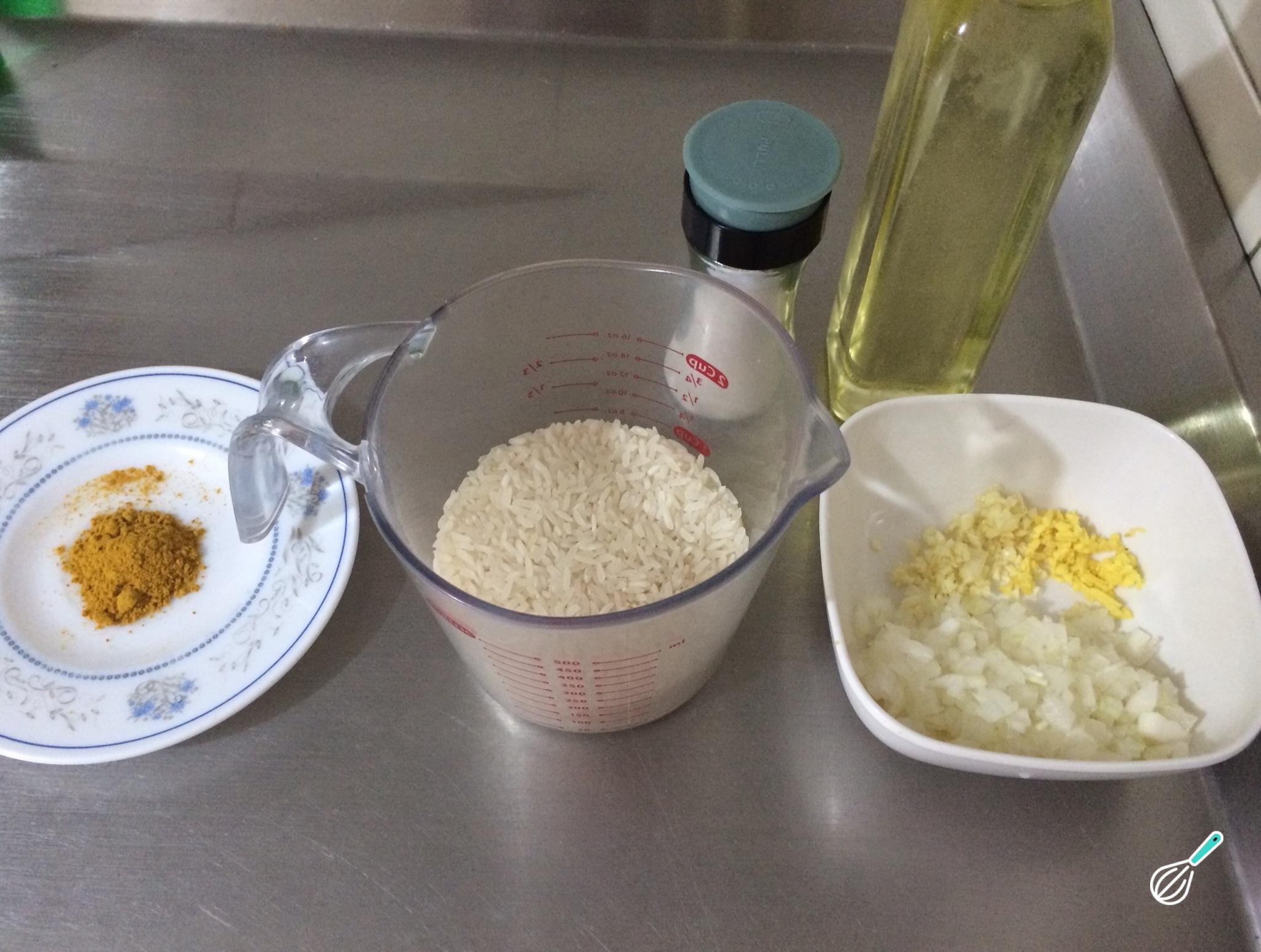 Antes de fazer este arroz aromatizado com açafrão, o primeiro passo é juntar todos os ingredientes.