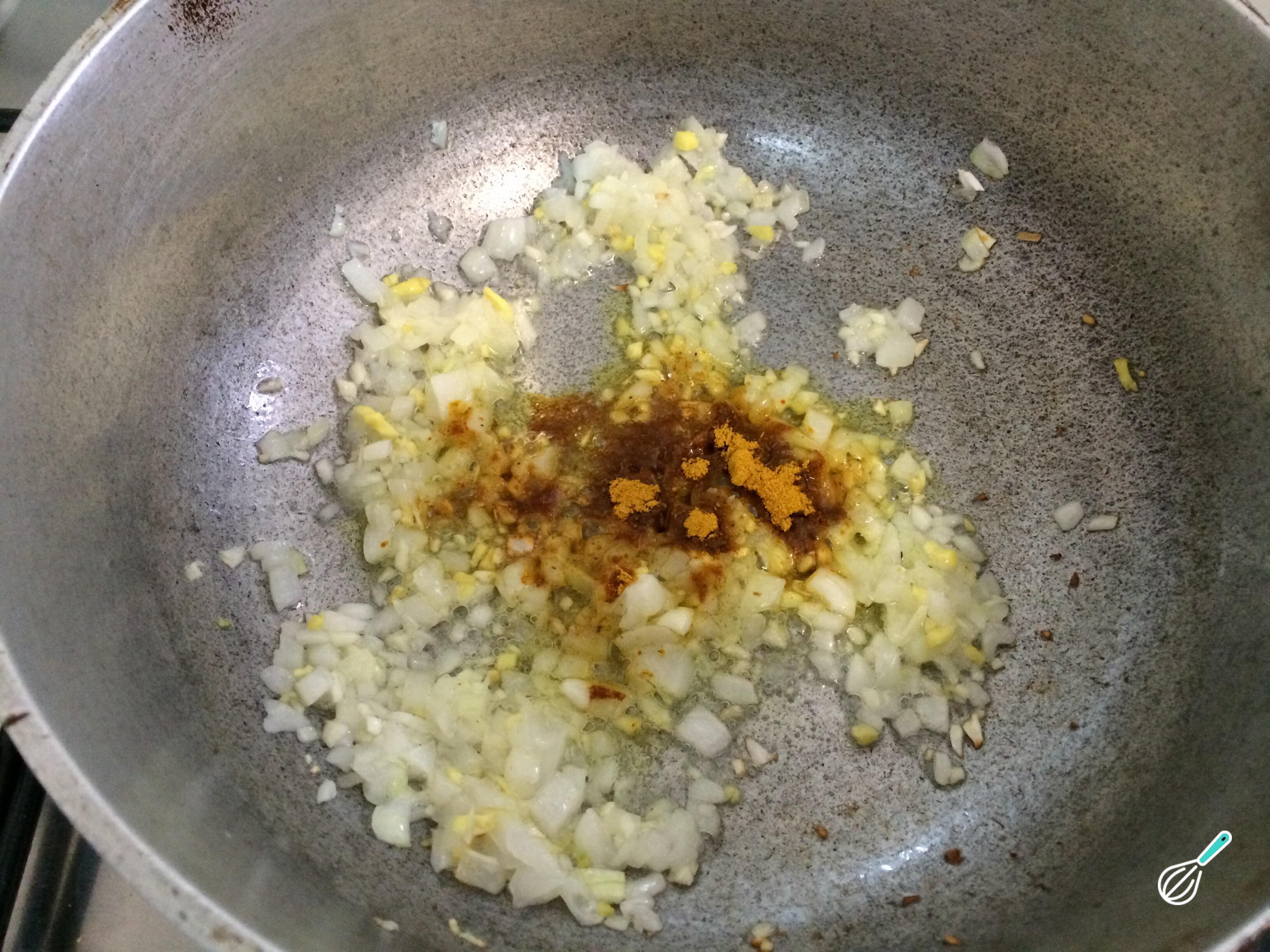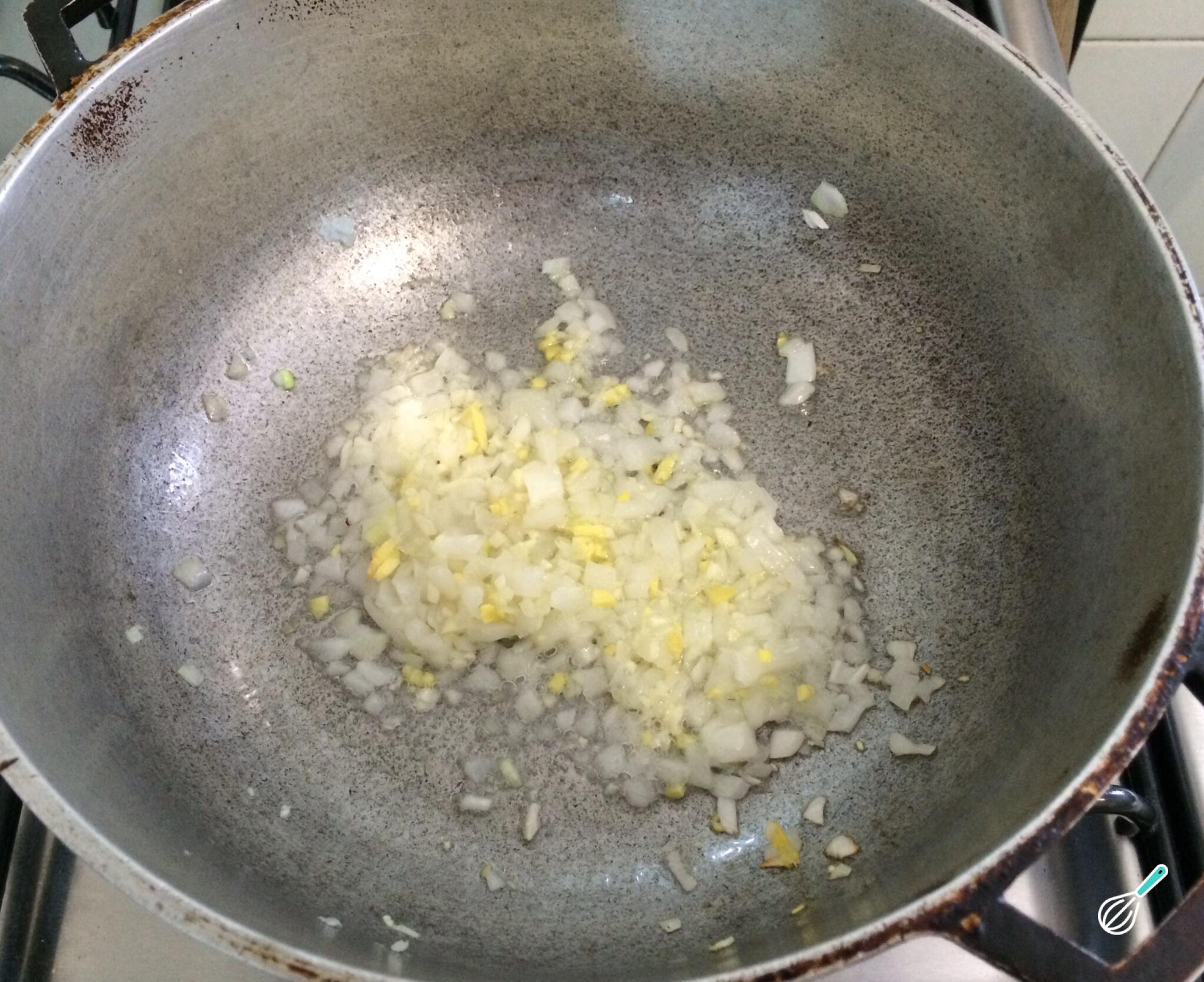 Em uma panela em fogo baixo com óleo, refogue a cebola, o alho e o gengibre picado até a cebola ficar translúcida. Tempere com uma pitada de sal.