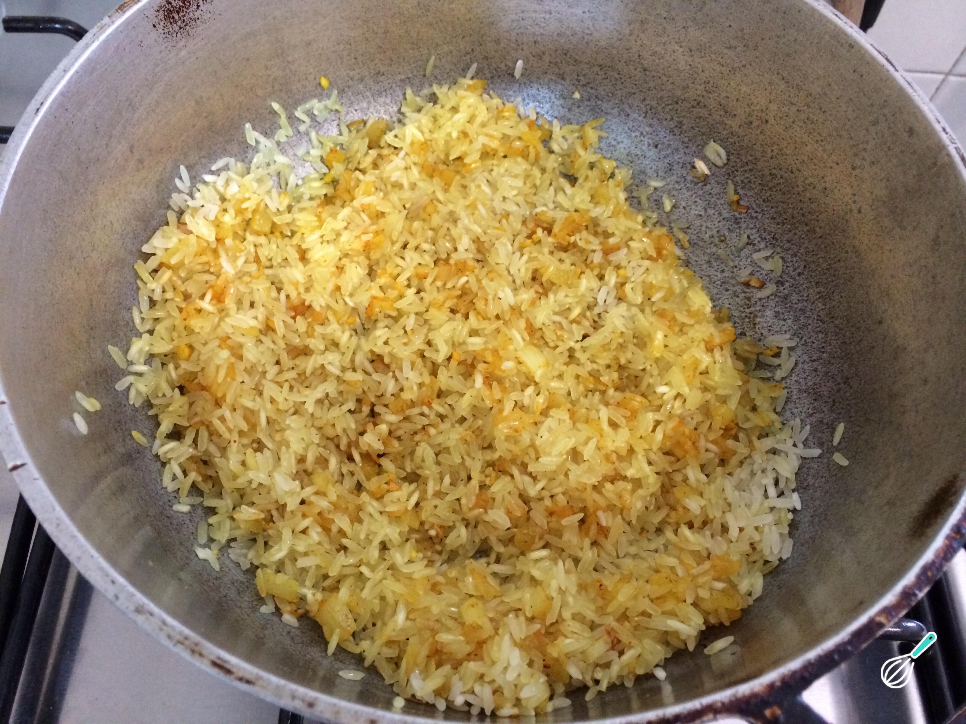 Adicione o arroz e cozinhe-o junto com os restantes ingredientes, até que fique ligeiramente transparente.