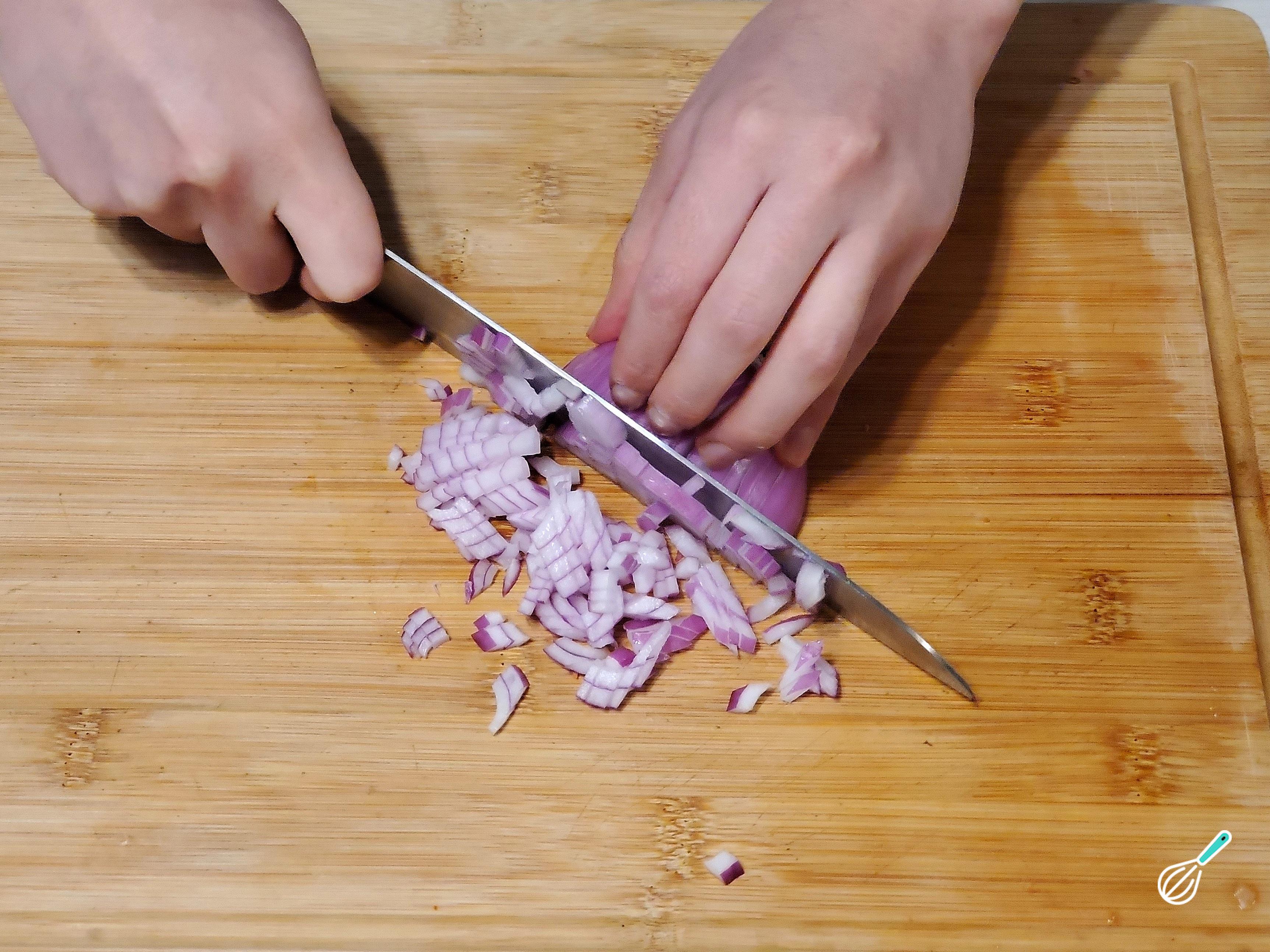 Comece cortando a cebola finamente ou em cubinhos, pique também o alho finamente. Além disso, se você não conseguiu pasta de azeitona, comece a prepará-la. Para fazer isso, coloque as azeitonas sem caroço no liquidificador, adicione um pouco de água e bata até ficar um purê.