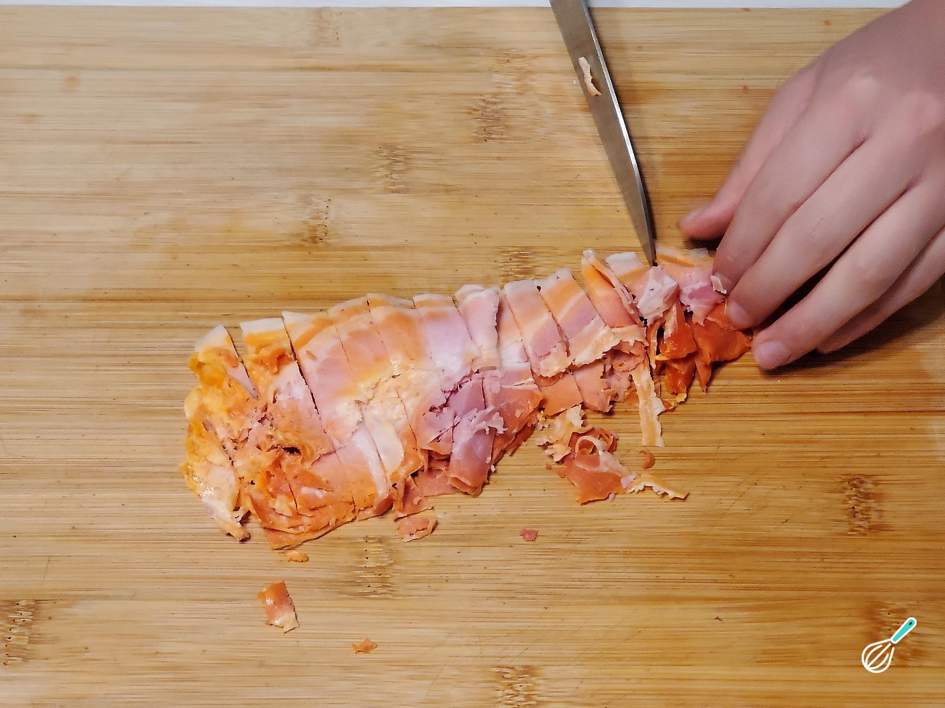 Além disso, corte o bacon em tiras, mantendo as 3 camadas de carne e gordura em cada pedaço. Da mesma forma, pique as nozes torradas de forma rústica.