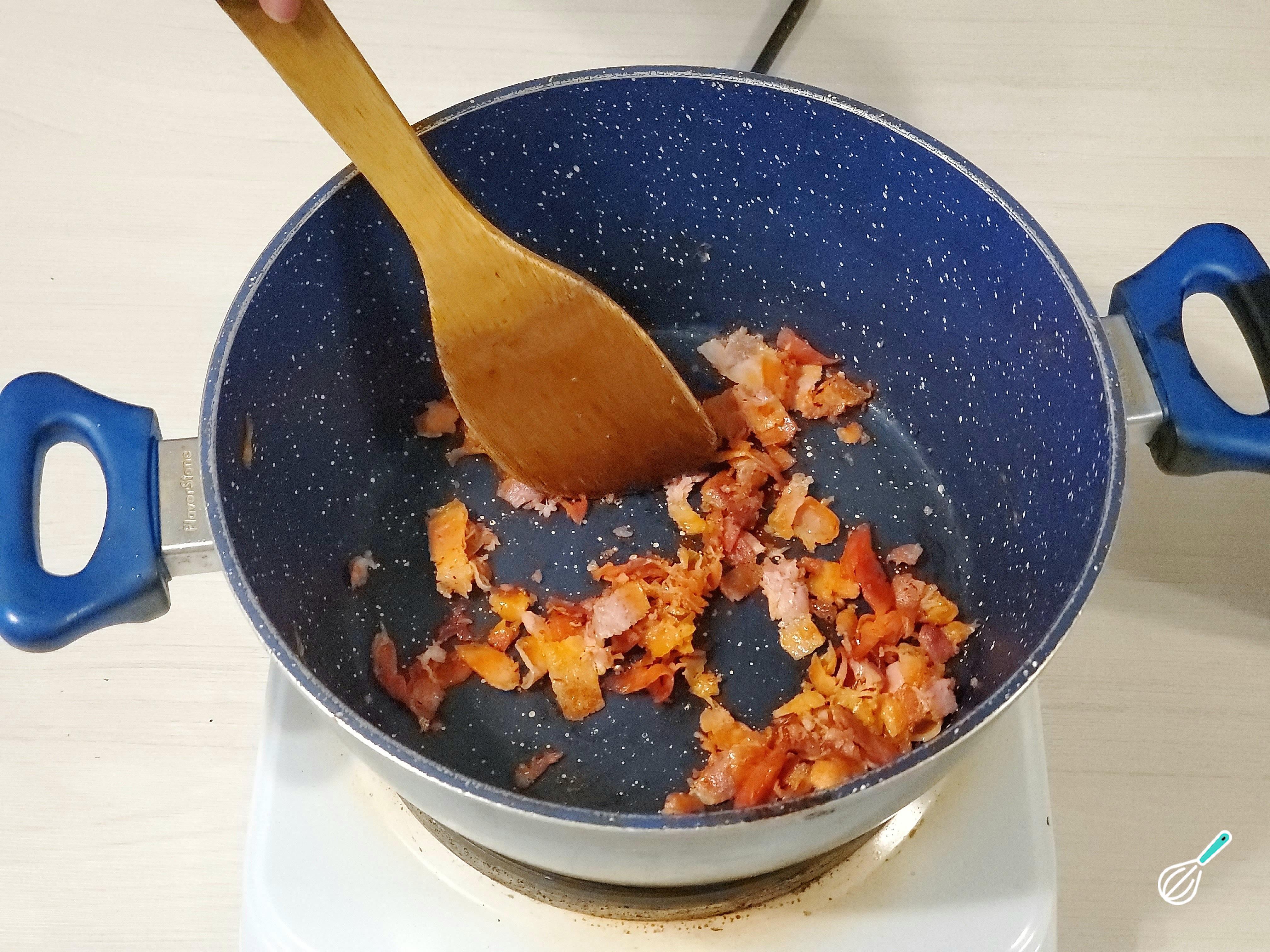- Substitua o arroz branco por arroz arbóreo e comece por dourar o bacon.