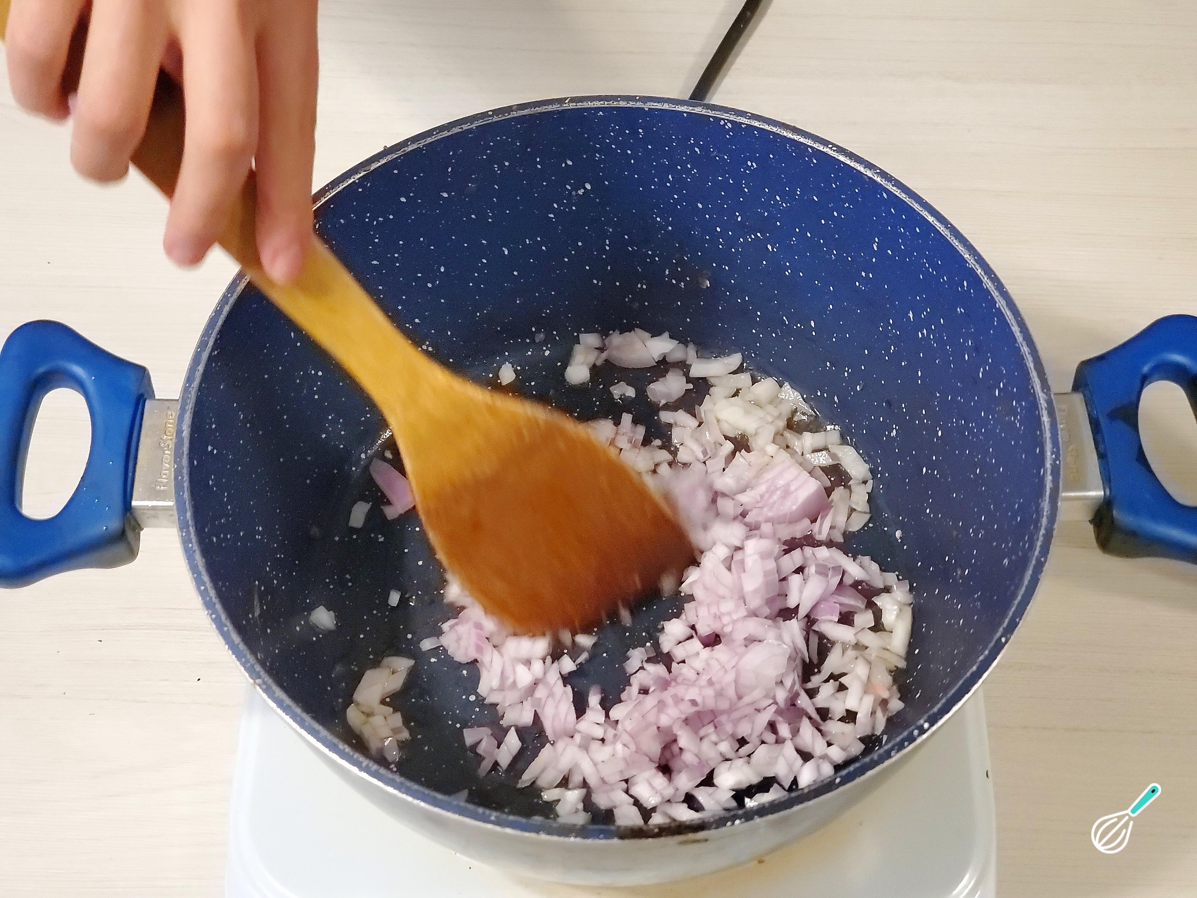A seguir, na mesma panela e com a gordura do bacon, refogue a cebola até ficar translúcida.