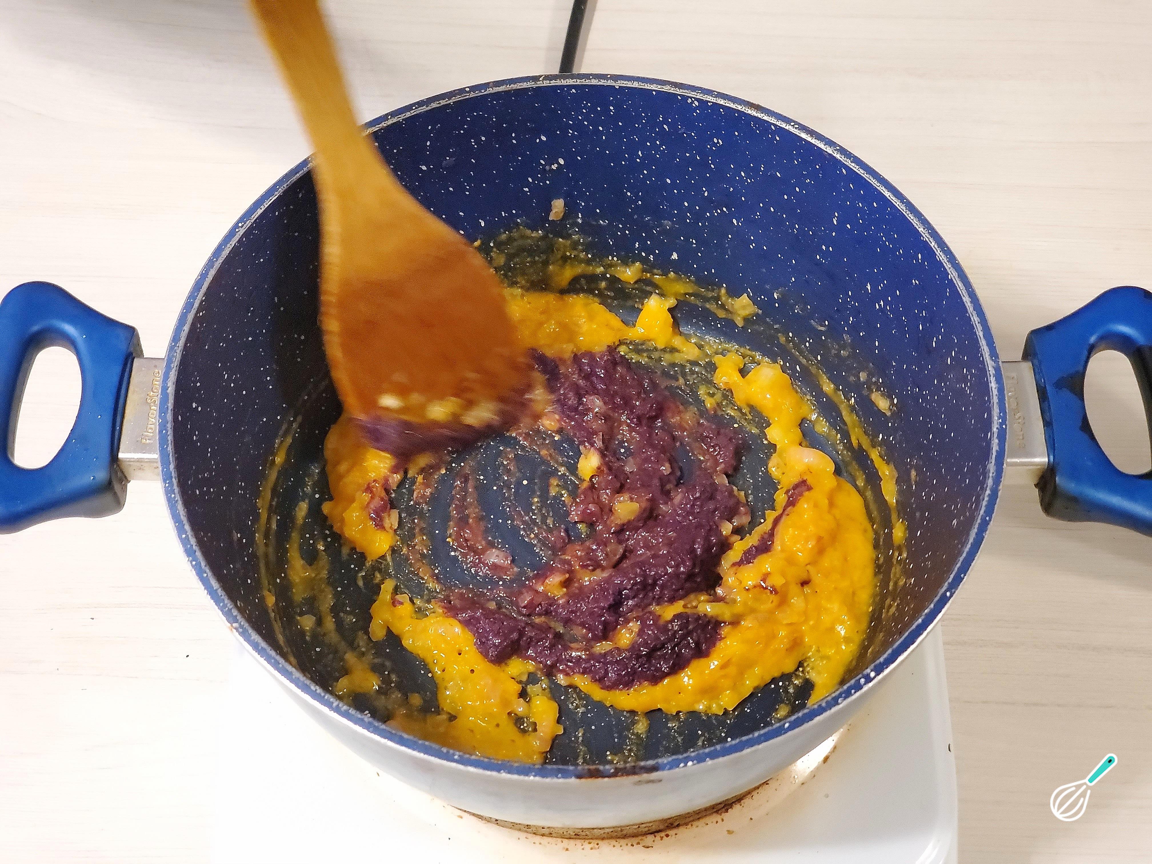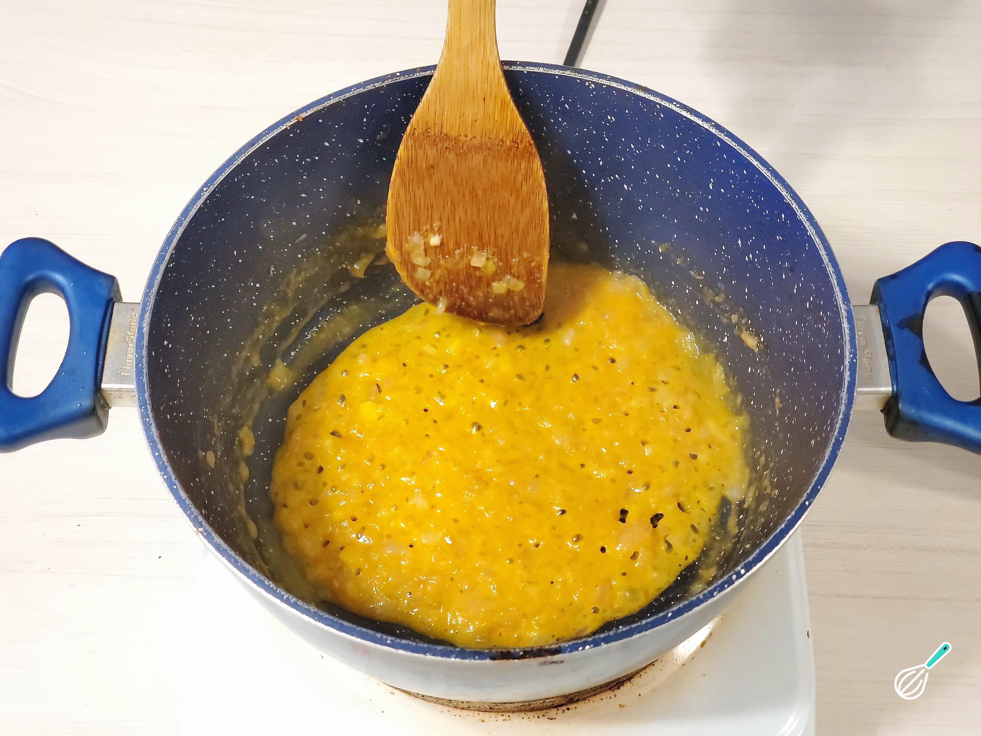Em seguida, adicione o alho e continue refogando por alguns minutos e acrescente a pasta de pimentão amarelo. Manter no fogo, mexendo esporadicamente, por 5 minutos ou até obter textura de geleia.