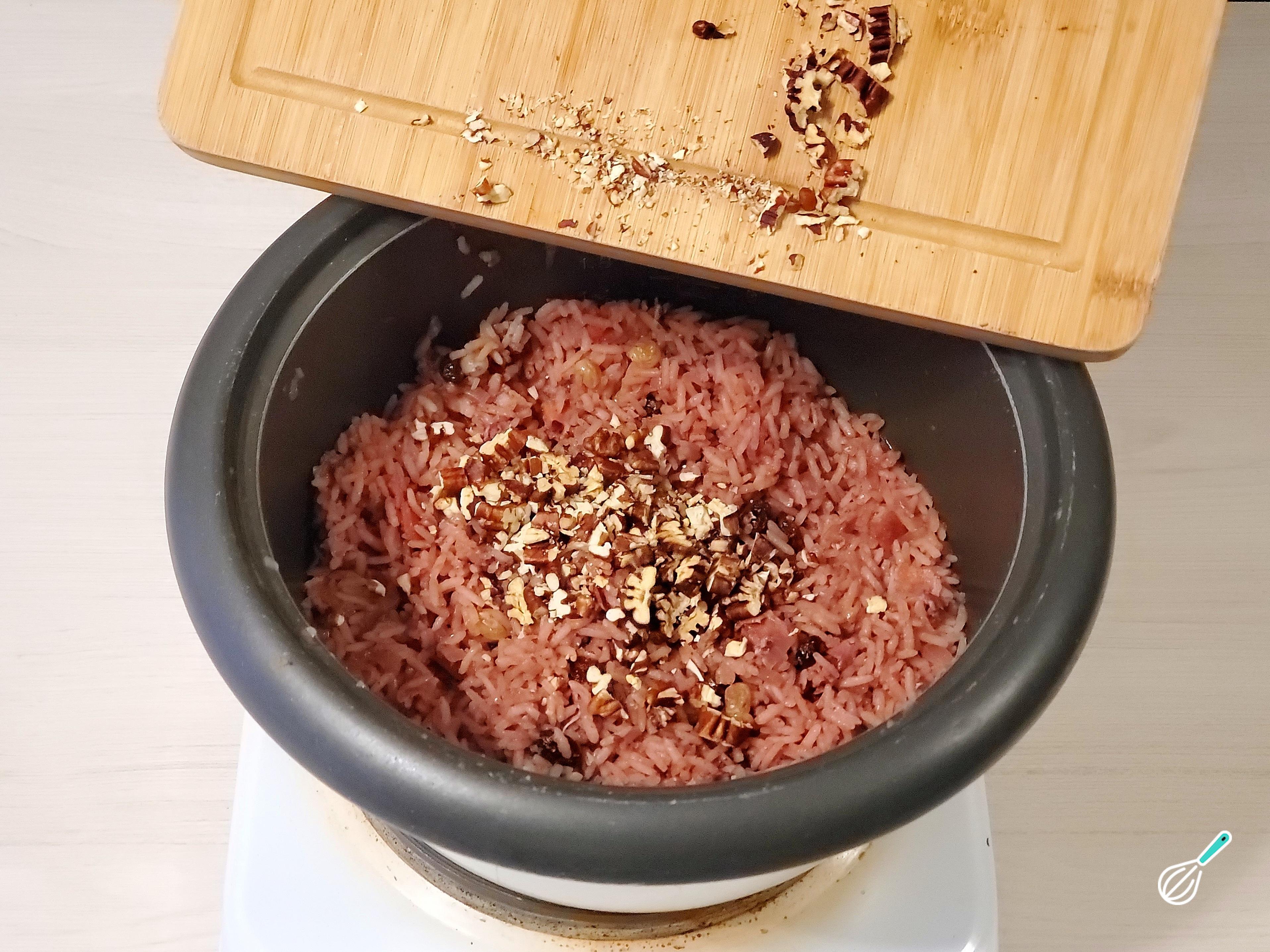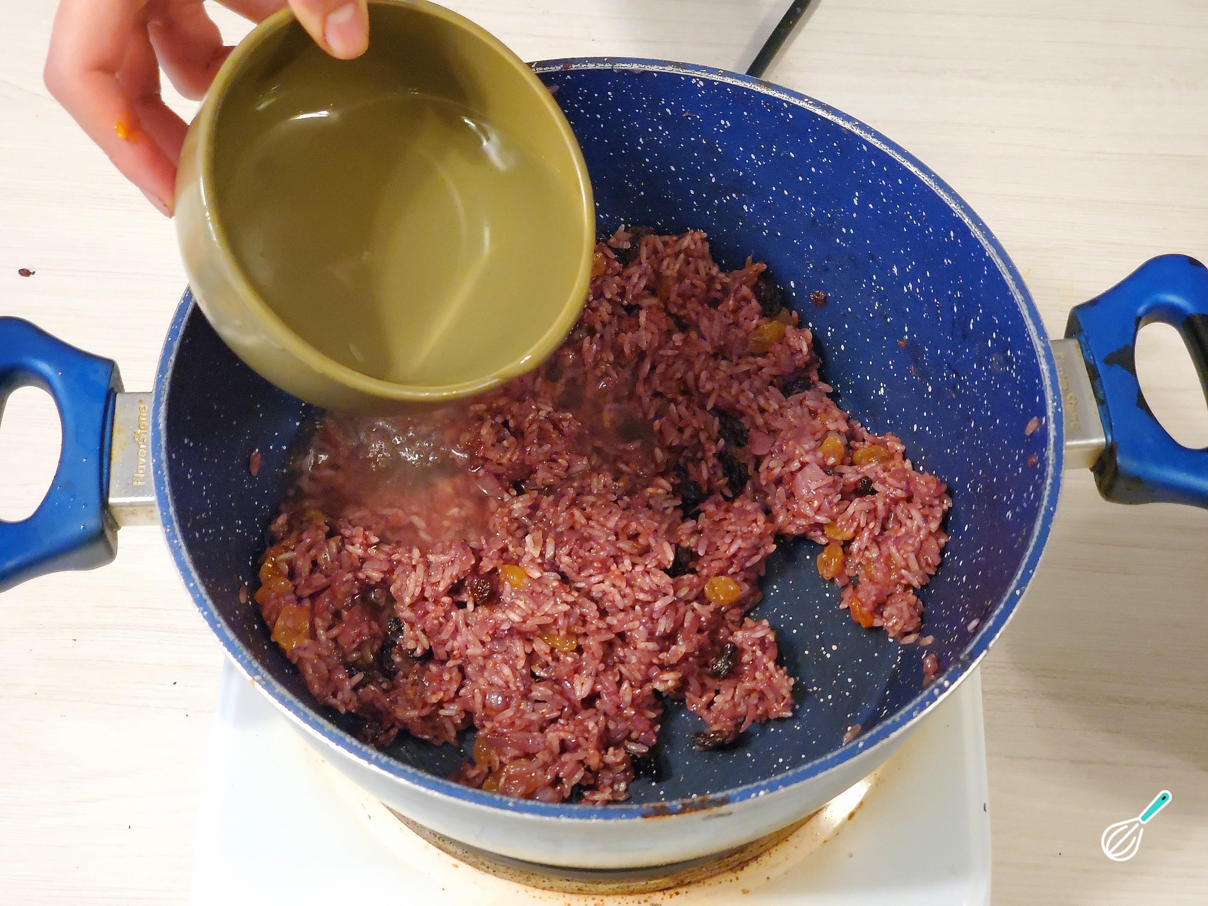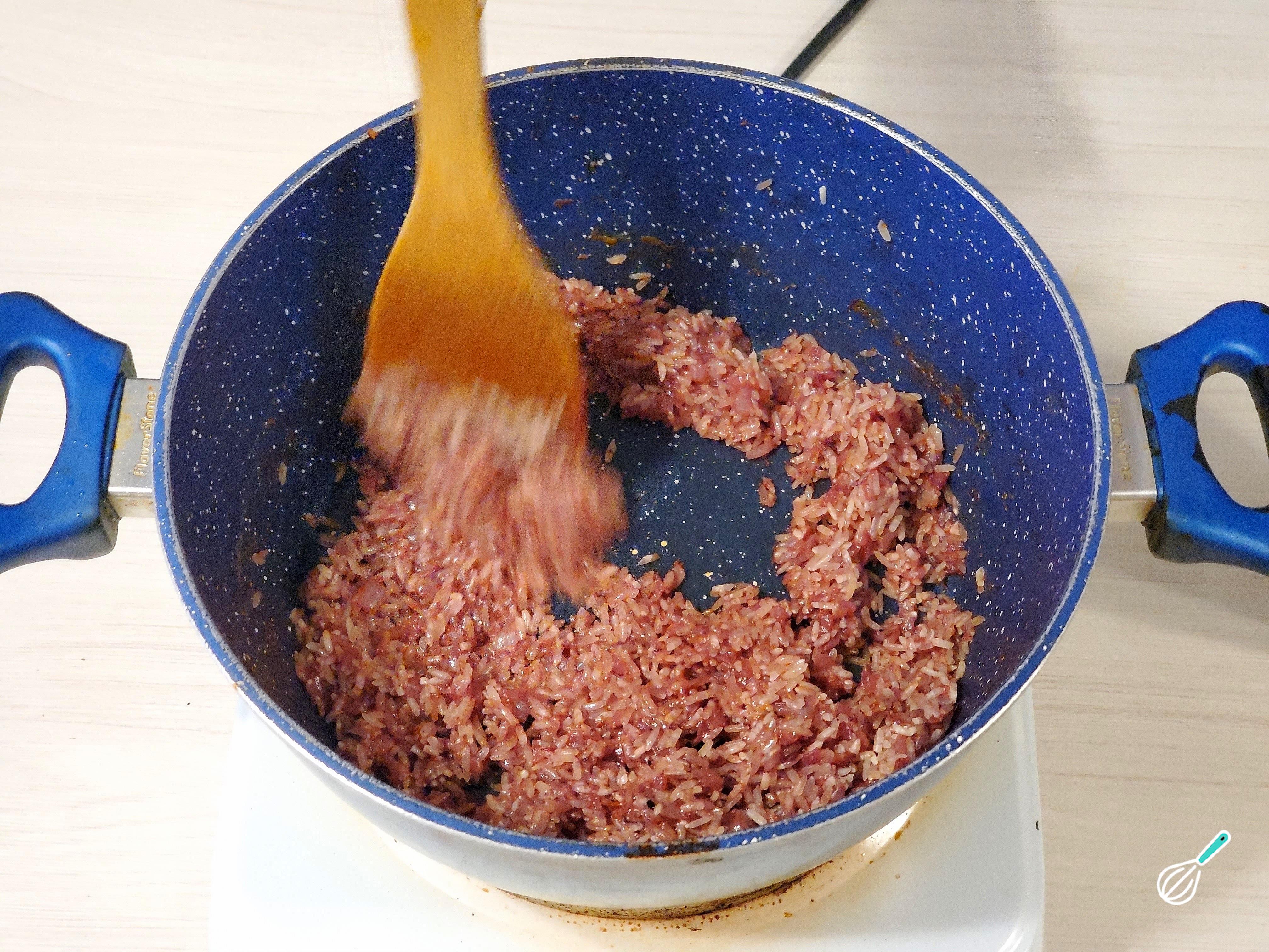 Em seguida, adicione o arroz previamente lavado e refogue, ou seja, mexa-o constantemente até que todo o molho esteja distribuído entre cada grão e fiquem translúcidos. Se notar que o arroz não está muito roxo, acrescente mais algumas colheres de sopa de purê de azeitona.