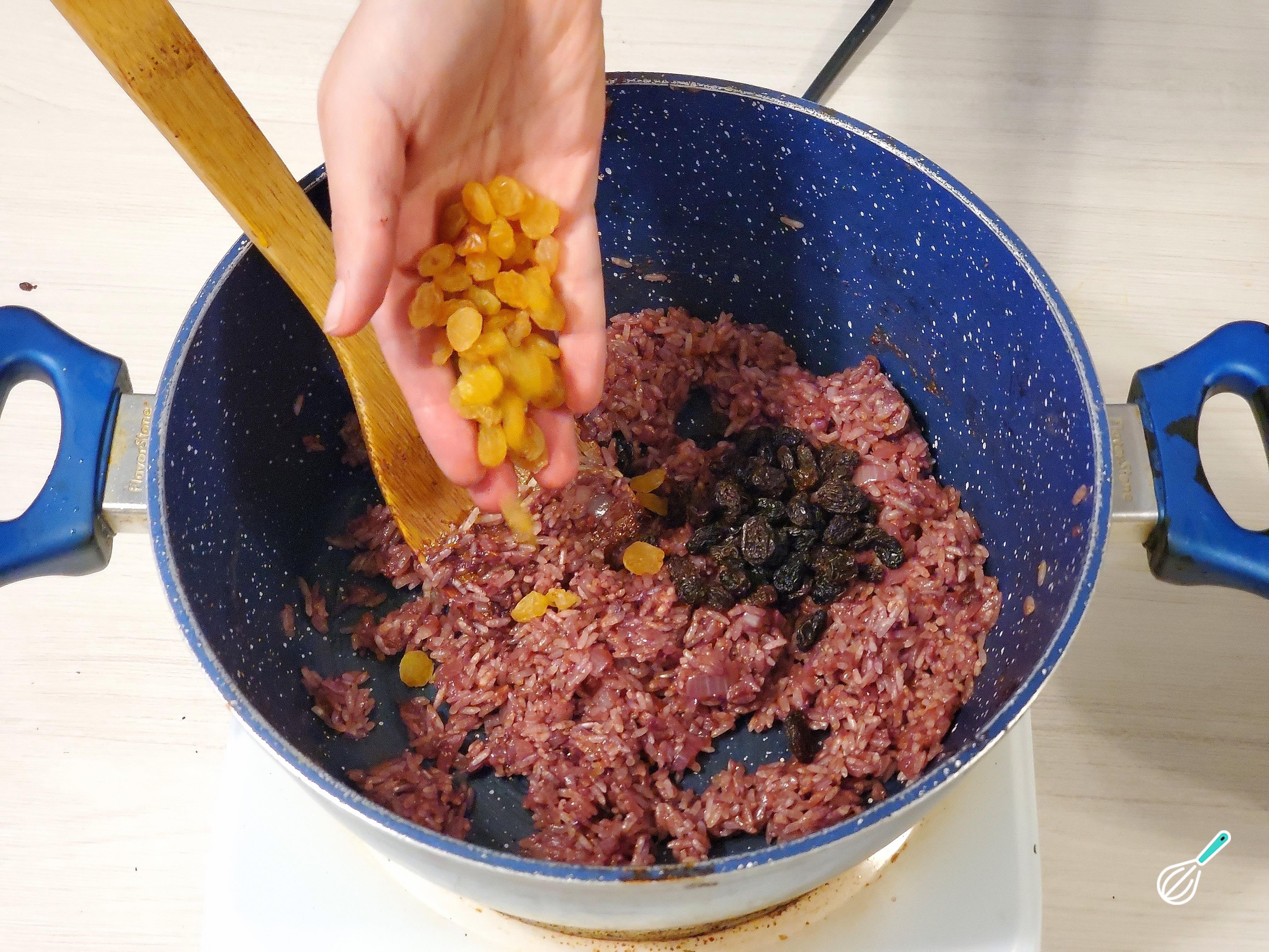 Antes de cobrir com água, acrescente as passas brancas, as passas pretas e o bacon previamente dourado.