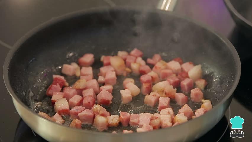 Para começar a fazer este prato de arroz com bacon e milho, a primeira coisa que tem de fazer é fritar o bacon picado até ficar dourado e crocante. De seguida, escorra bem o óleo e coloque-o sobre papel absorvente para retirar o excesso.