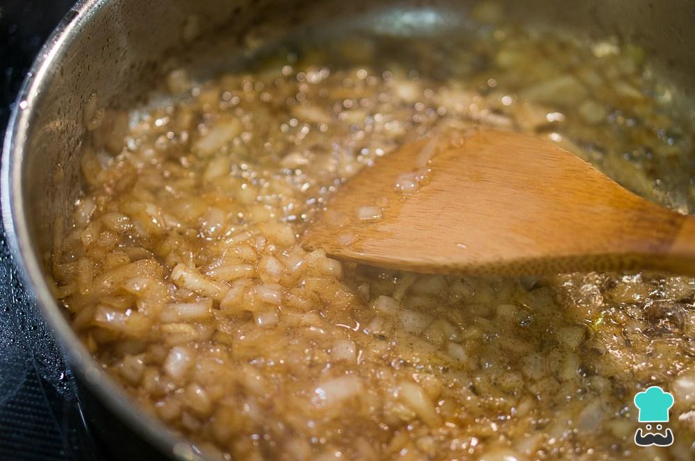 Na mesma panela, refogue a cebola e o alho finamente picados em fogo baixo até que a cebola esteja transparente. Junte a lata de milho e misture tudo. Imediatamente depois, junte o caldo de galinha e a água.