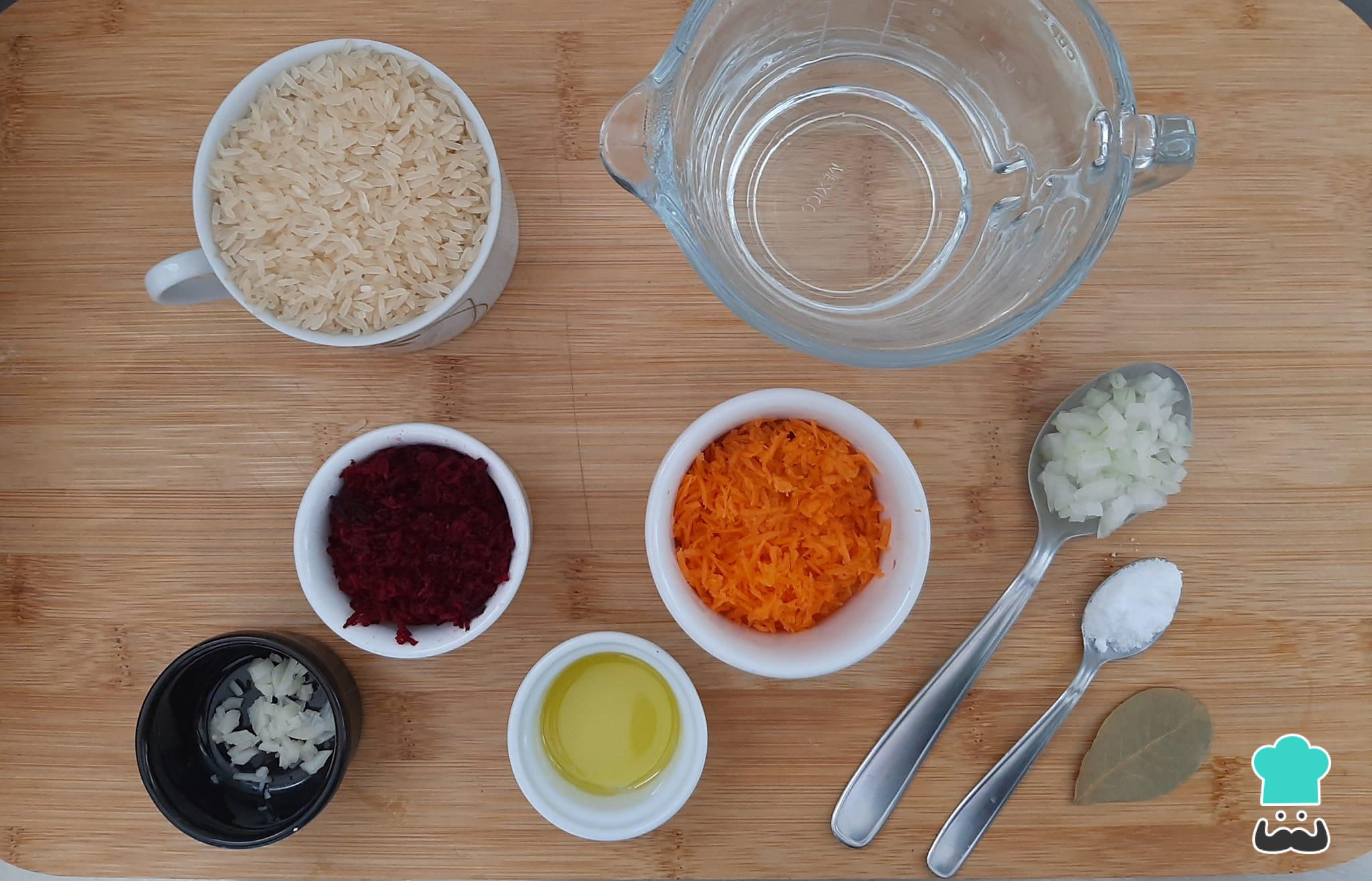 Separe os ingredientes necessários para o preparo desta receita de arroz com beterraba e cenoura.