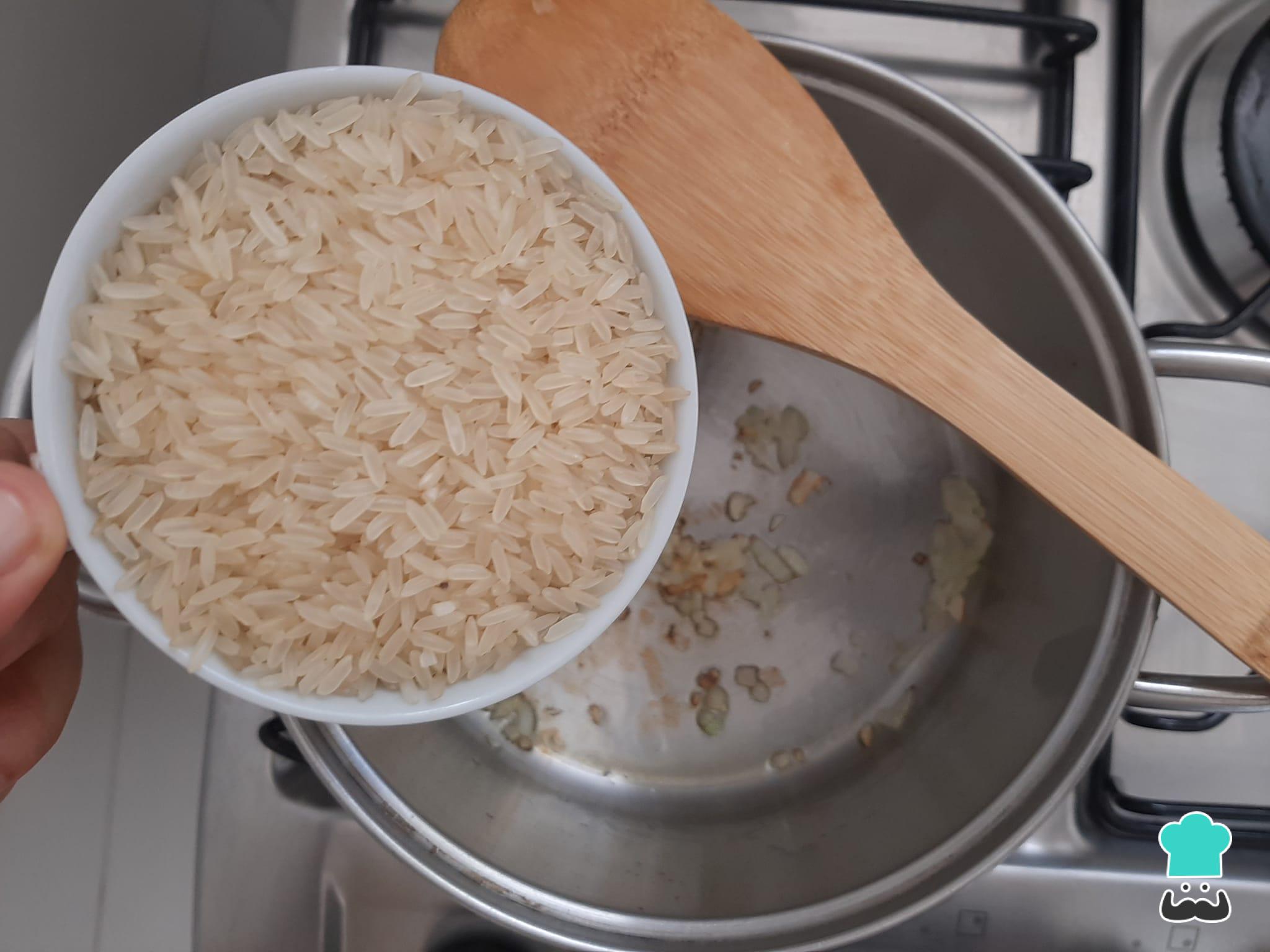 Numa panela média, aqueça o azeite de oliva e refogue a cebola e o alho picados. Em seguida adicione o arroz cru a este refogado.