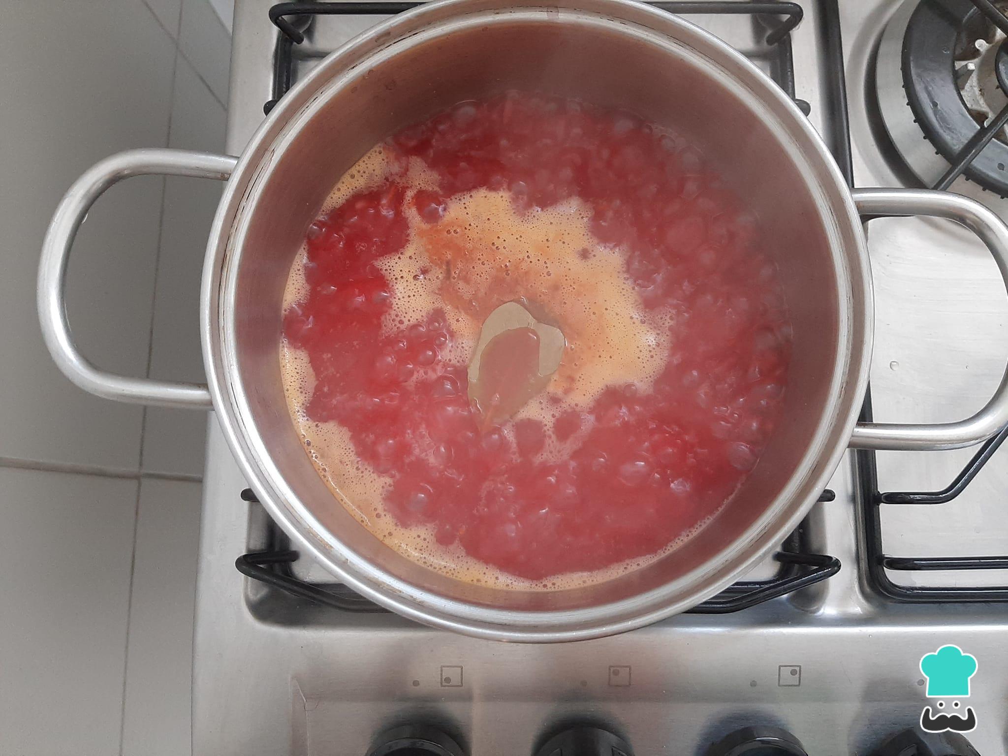 Adicione a água quente ao refogado. Acrescente a folha de louro e tempere com sal (a gosto).