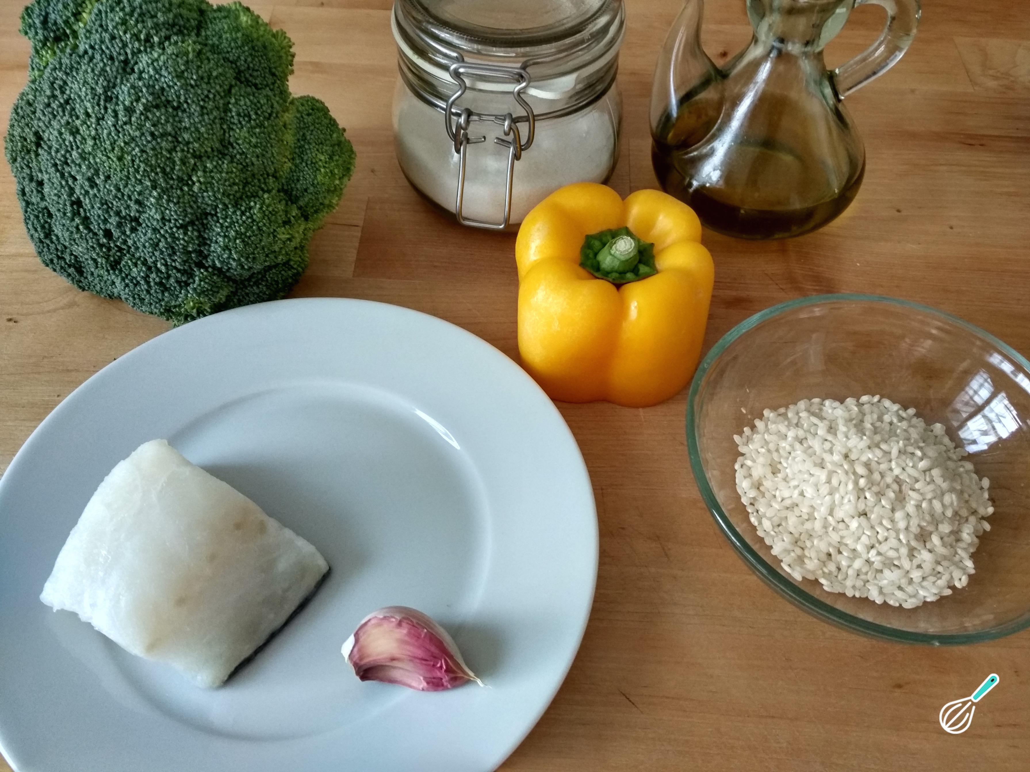 Comece por juntar todos os ingredientes para fazer o arroz com brócolis e bacalhau.