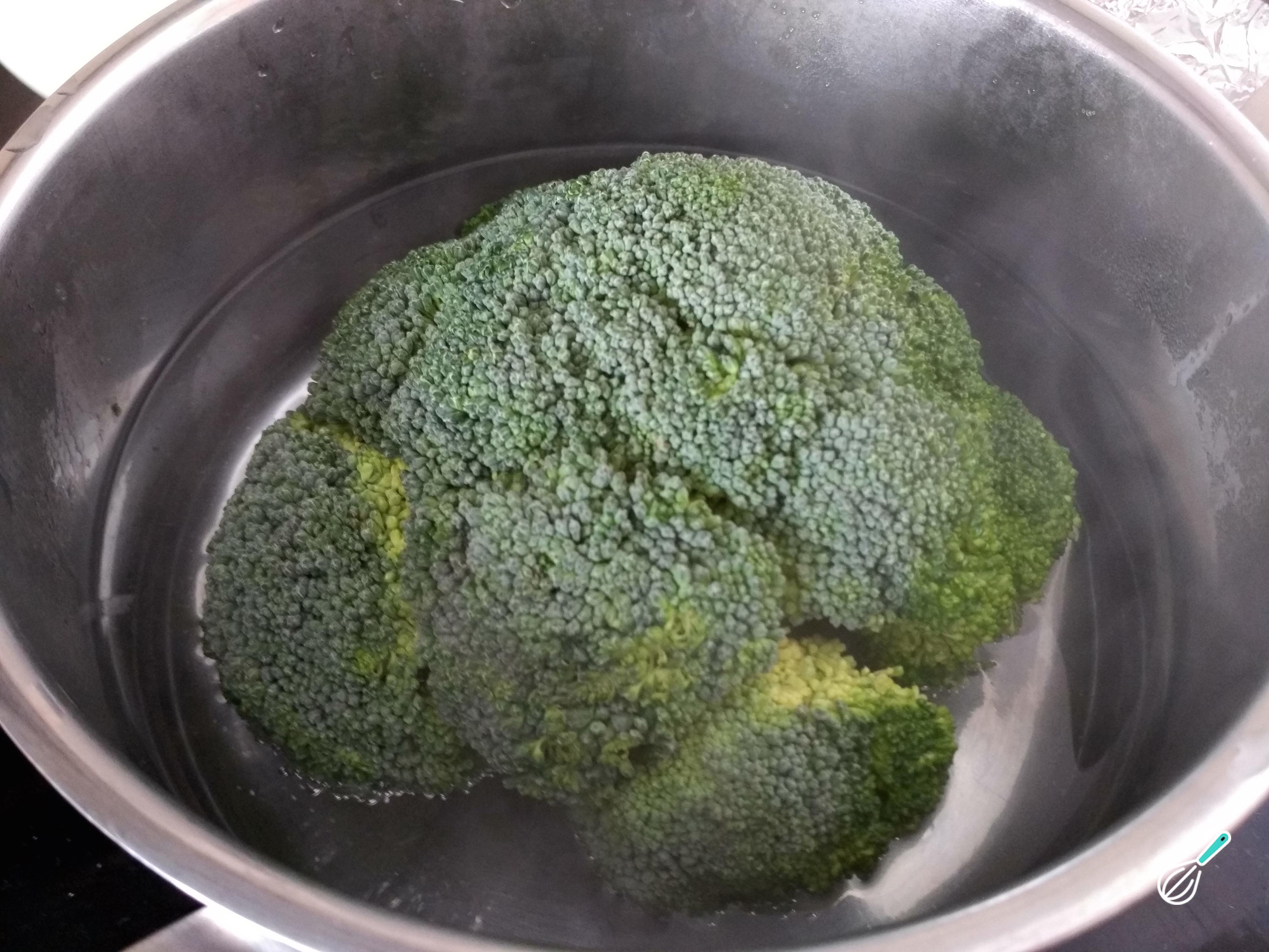 Cozinhe o brócolis em água fervente abundante com um pouco de sal. Deixe cozinhar por 10 minutos, escorra e reserve.