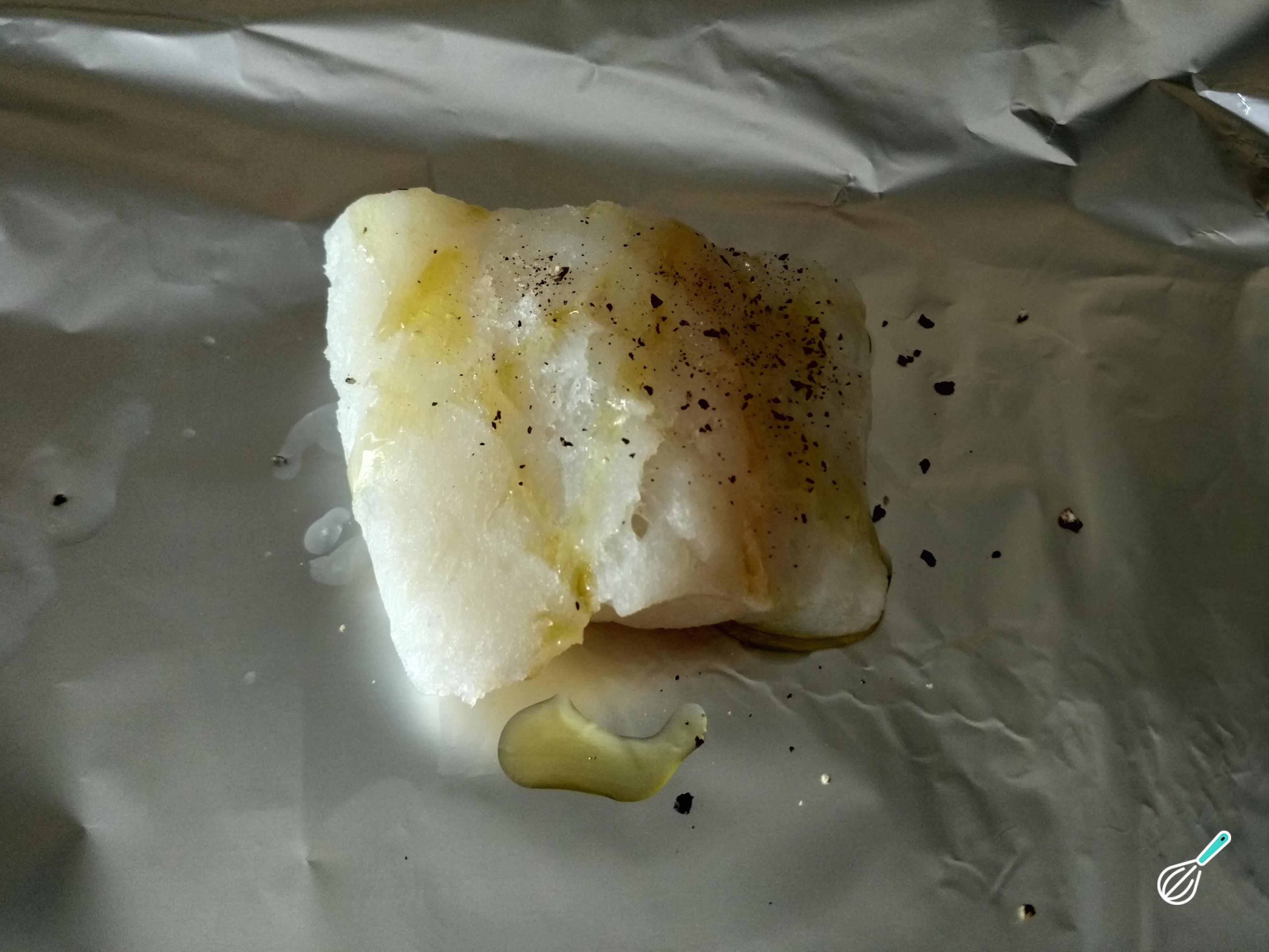 Coloque o bacalhau no forno a 180 ° C com um pouco de pimenta do reino e azeite. Asse o bacalhau com a técnica do papillote, envolvendo o peixe em papel alumínio e fazendo um pacote para que cozinhe com os seus próprios sucos. O tempo de cozimento é de cerca de 14 minutos.