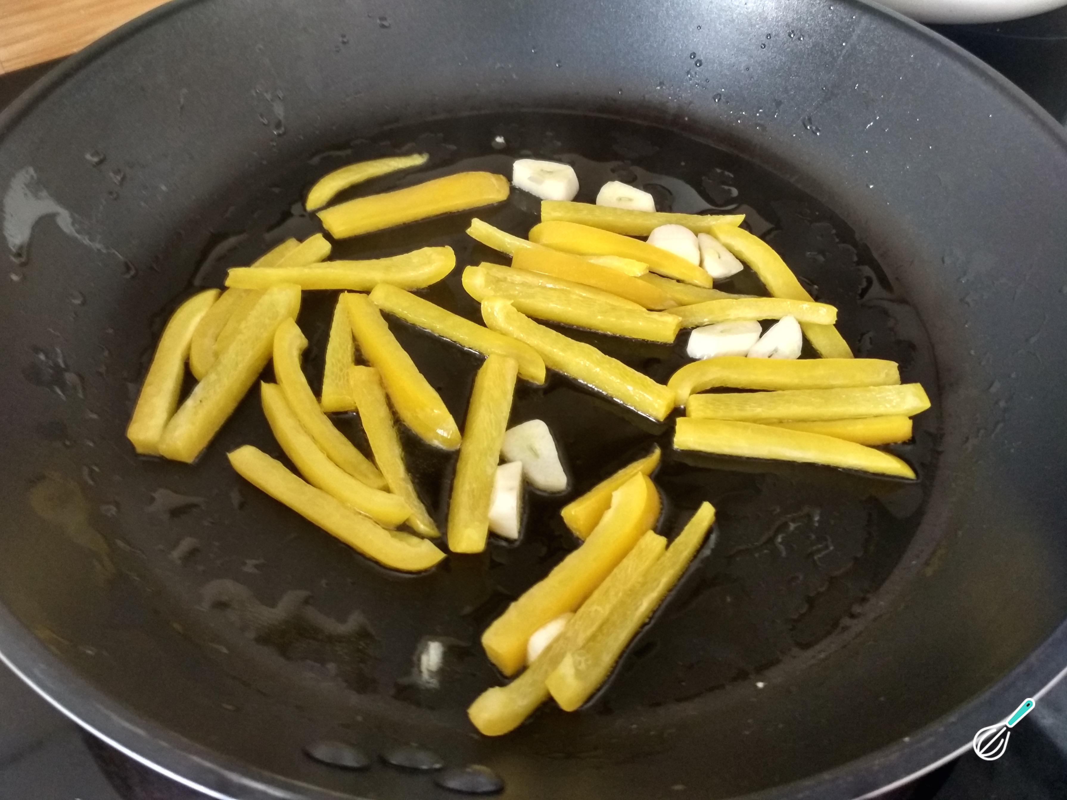 Em uma frigideira, faça um refogado com alho picado, um pouco de azeite e a pimentão amarelo cortado em tiras fininhas. Deixe cozinhar por 4 minutos em fogo baixo.