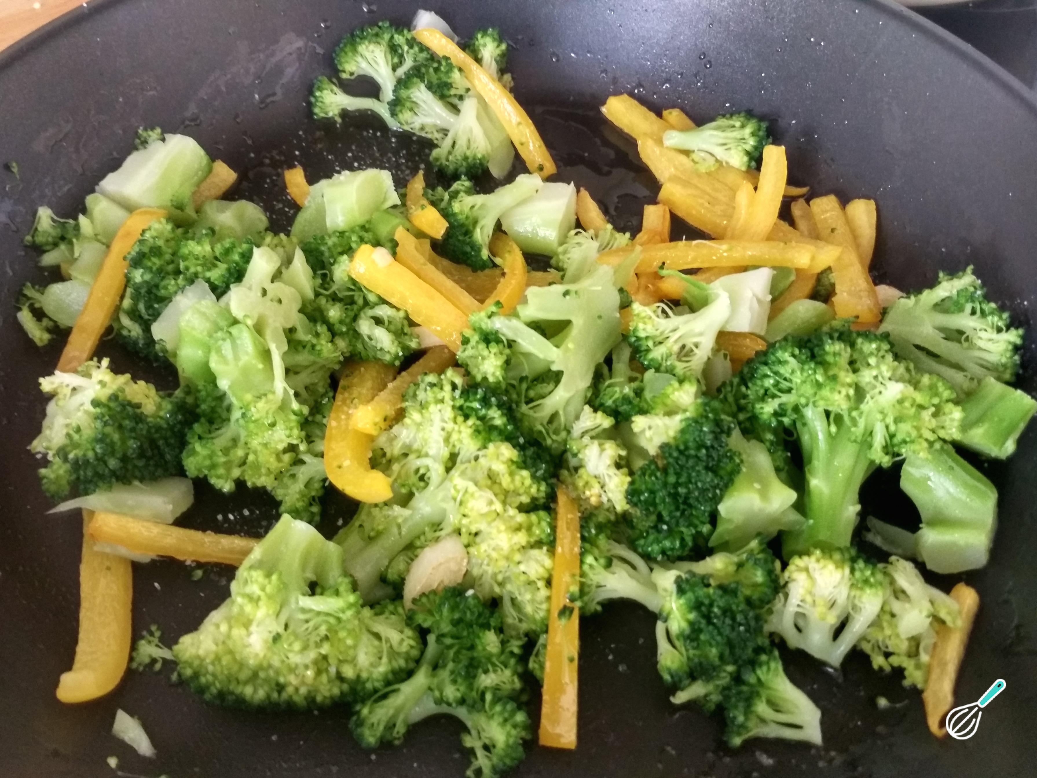 Em seguida, adicione o brócolis cozido cortado em floretes e tempere com um pouco de sal. Deixe cozinhar por alguns minutos.