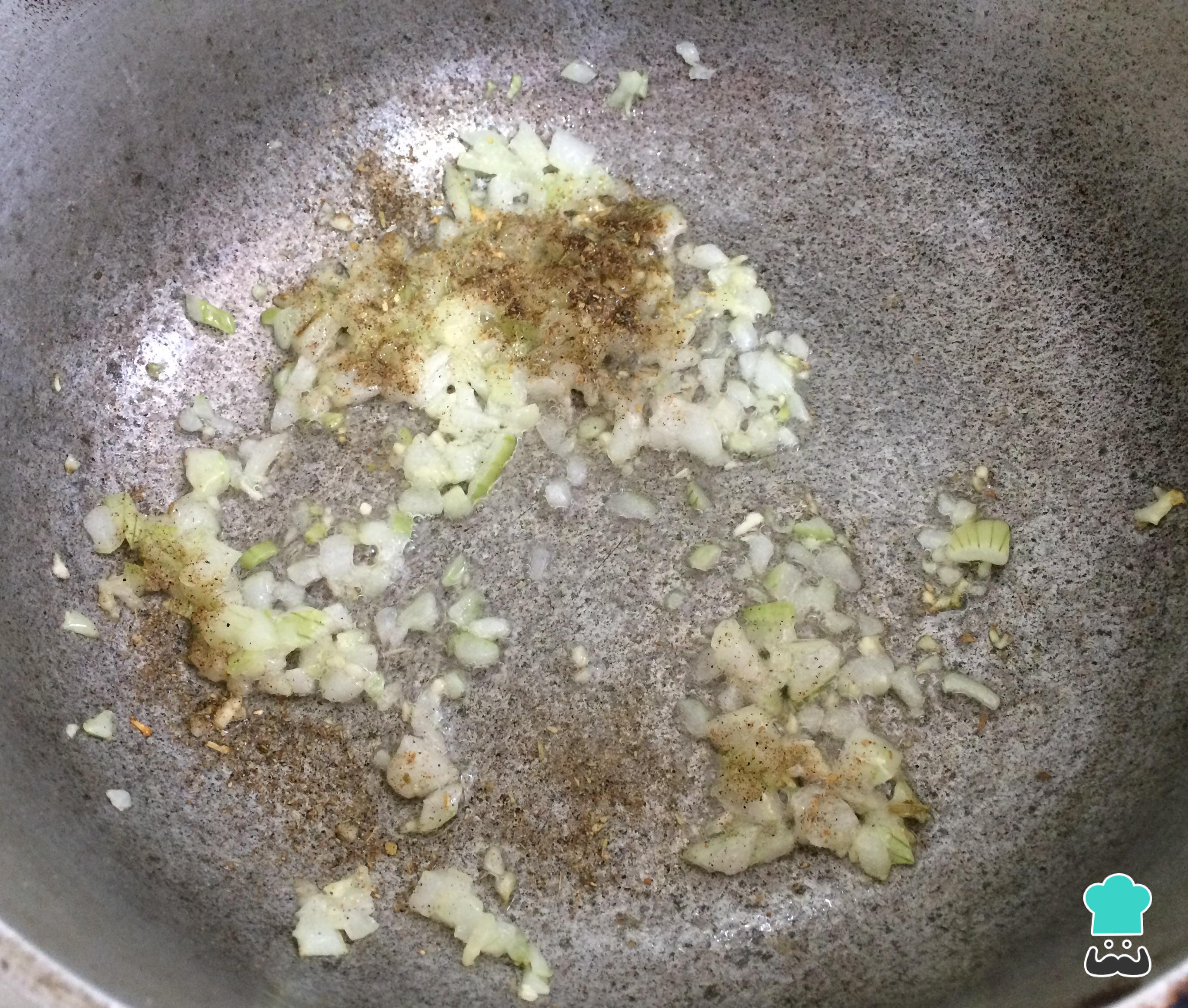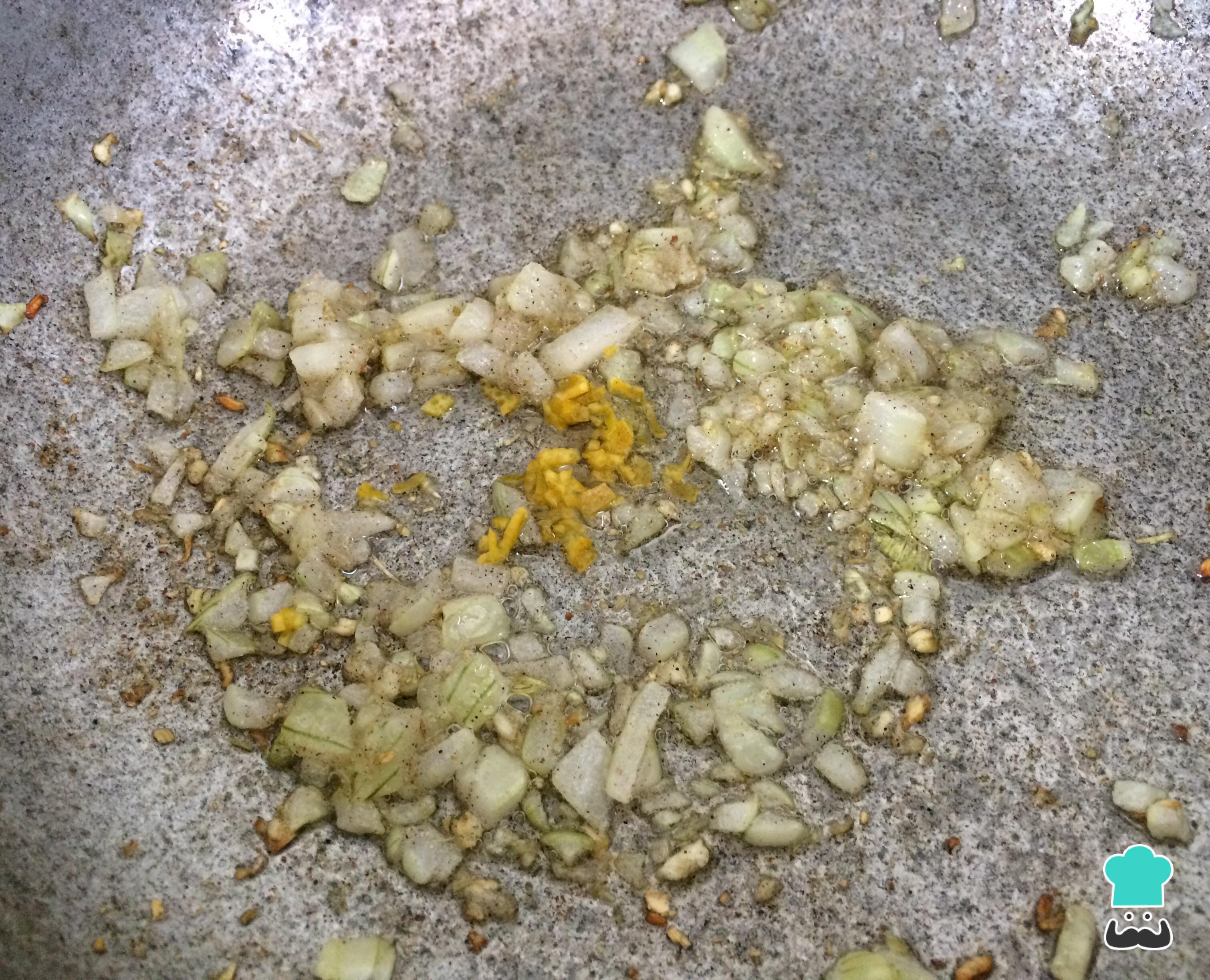 Em uma panela com óleo, refogue a cebola e o alho cortados finamente, e acrescente o cardomomo. Cozinhe em fogo baixo por 5 minutos, e tempere com sal e pimenta.
