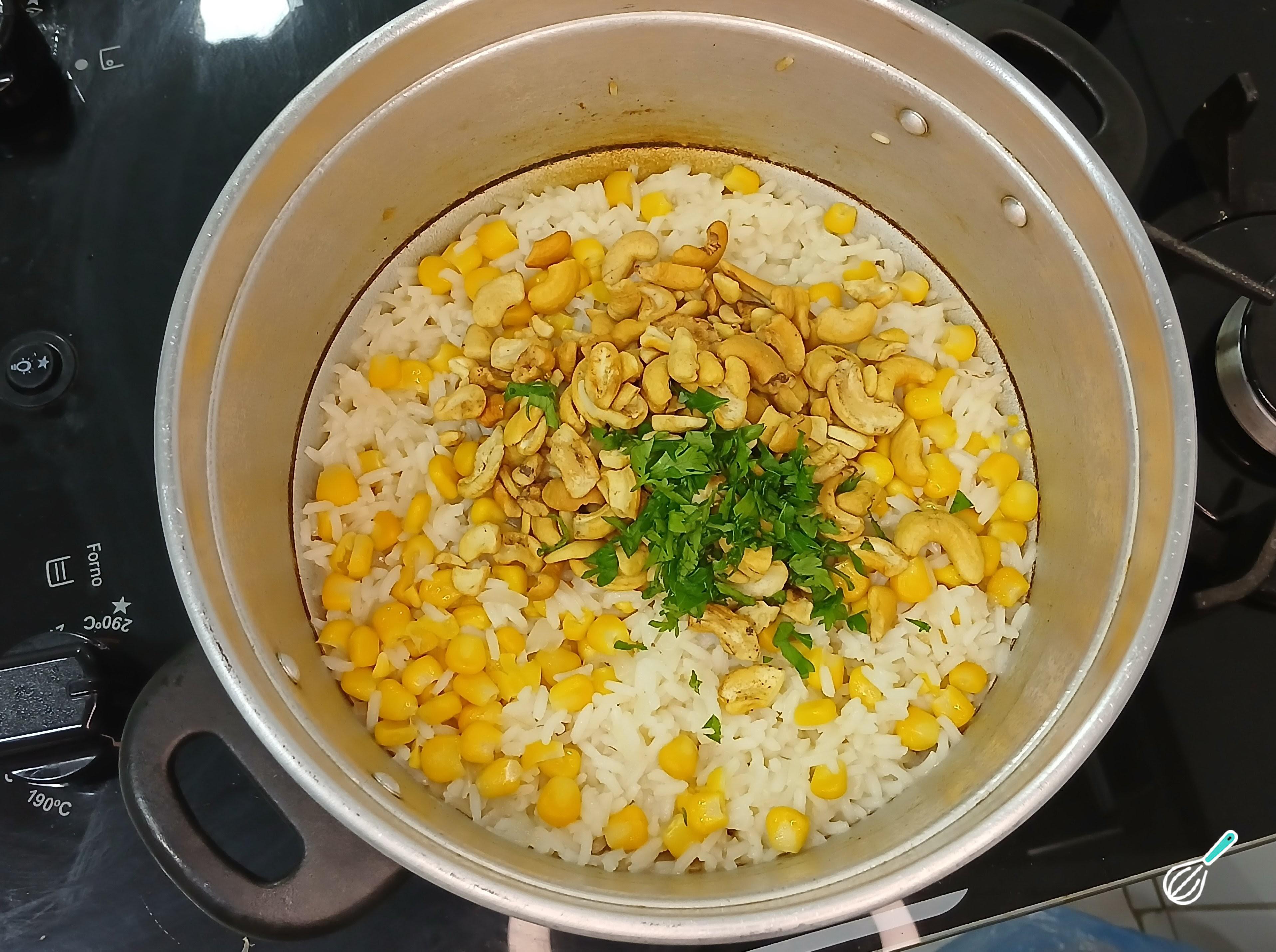 Assim que secar a água prove arroz e acerte o sal. Misture o milho ao arroz delicadamente de cima para baixo.