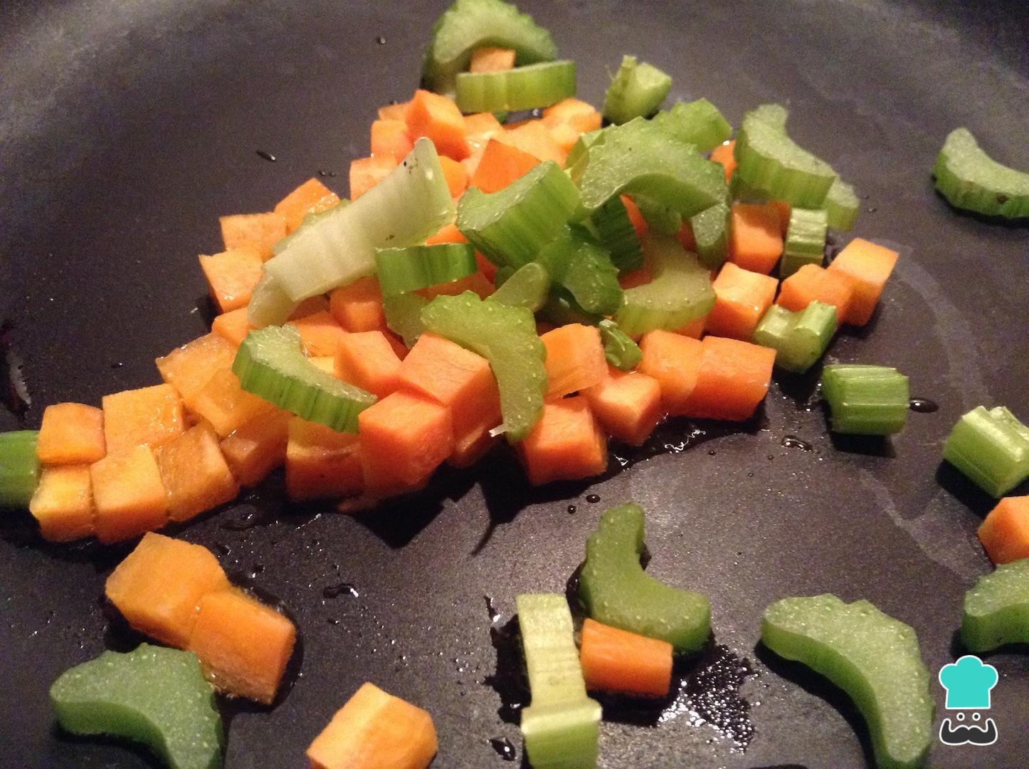 Leve ao fogo médio uma frigideira com o azeite de oliva e salteie aí a cenoura e o aipo por alguns minutos, até que fiquem macios. Tempere com sal e pimenta a gosto.