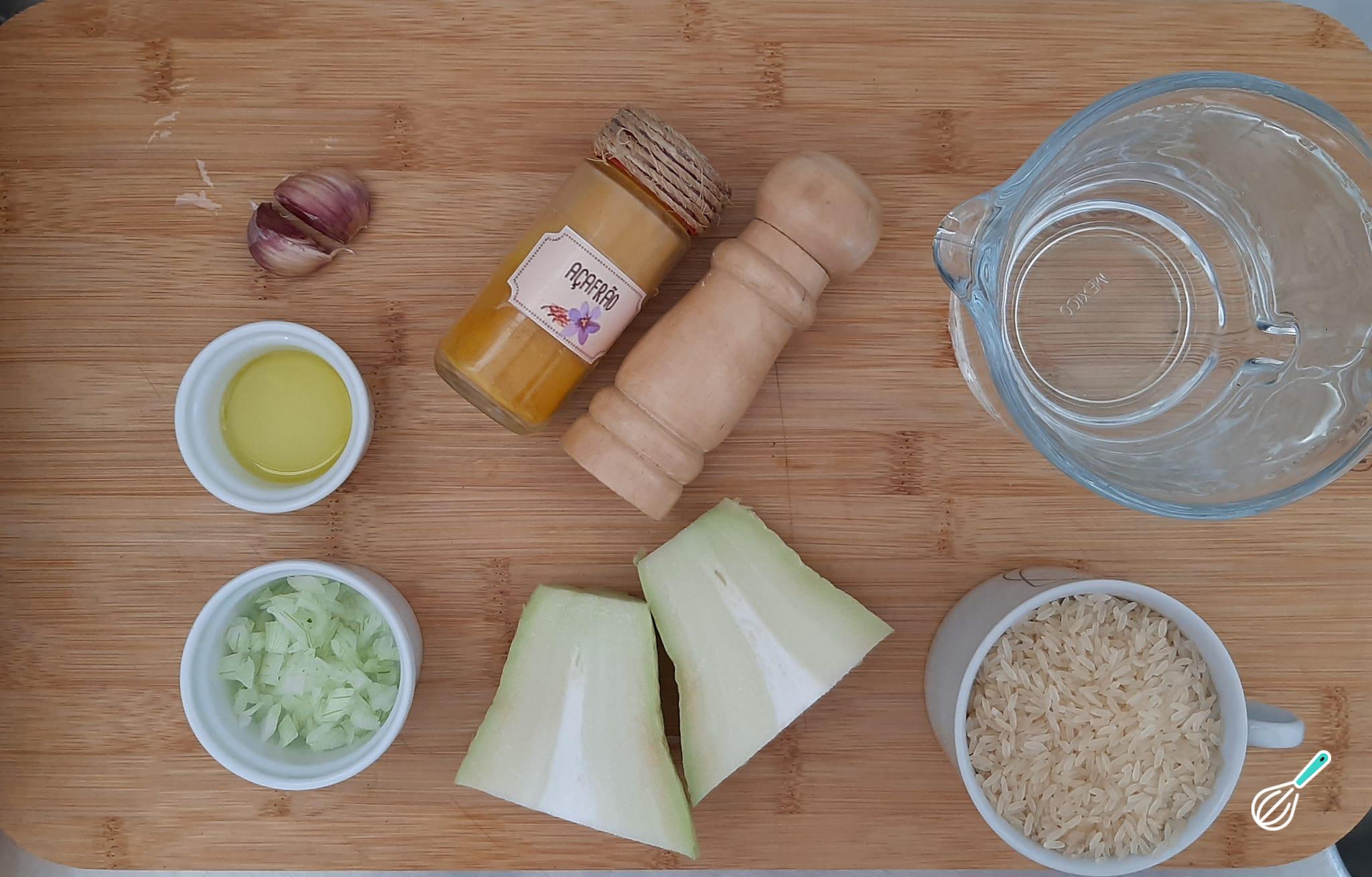 Separe os ingredientes necessários para preparar a receita de arroz com chuchu. O açafrão (ou cúrcuma) deixará seu arroz bem saboroso, por isso não o dispense!
